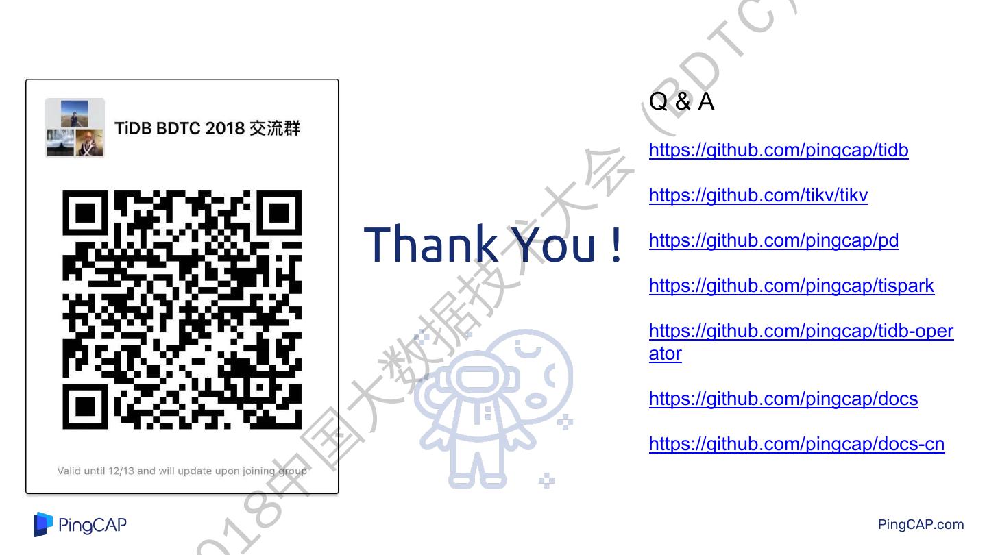 23 . TC BD Q&A ( https://github.com/pingcap/tidb 会 https://github.com/tikv/tikv 大 Thank You ! https://github.com/pingcap/pd 术 技 https://github.com/pingcap/tispark 据 https://github.com/pingcap/tidb-oper ator 数 https://github.com/pingcap/docs 大 国 https://github.com/pingcap/docs-cn 8中 PingCAP.com