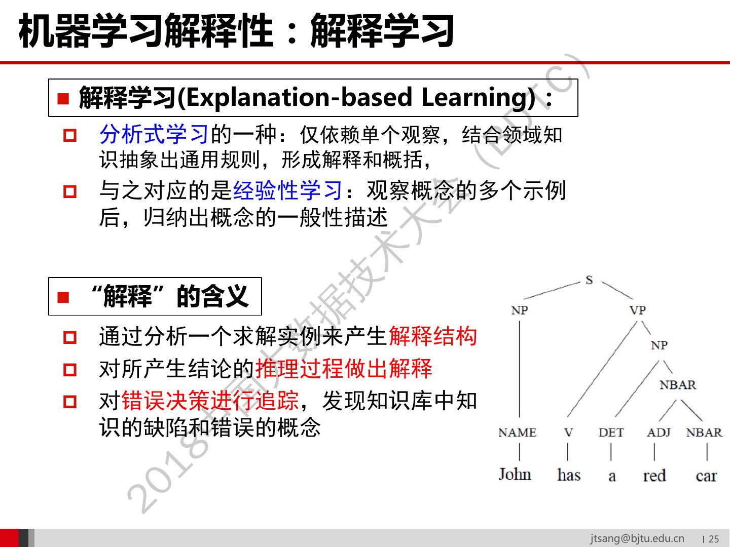 25 .机器学习解释性:解释学习 ) TC 解释学习(Explanation-based Learning): BD 分析式学习的一种:仅依赖单个观察,结合领域知 识抽象出通用规则,形成解释和概括, ( 与之对应的是经验性学习:观察概念的多个示例 会 后,归纳出概念的一般性描述 大 术 技 “解释”的含义 据 通过分析一个求解实例来产生解释结构 数 对所产生结论的推理过程做出解释 大 国 对错误决策进行追踪,发现知识库中知 识的缺陷和错误的概念 中 18 20 jtsang@bjtu.edu.cn25 25