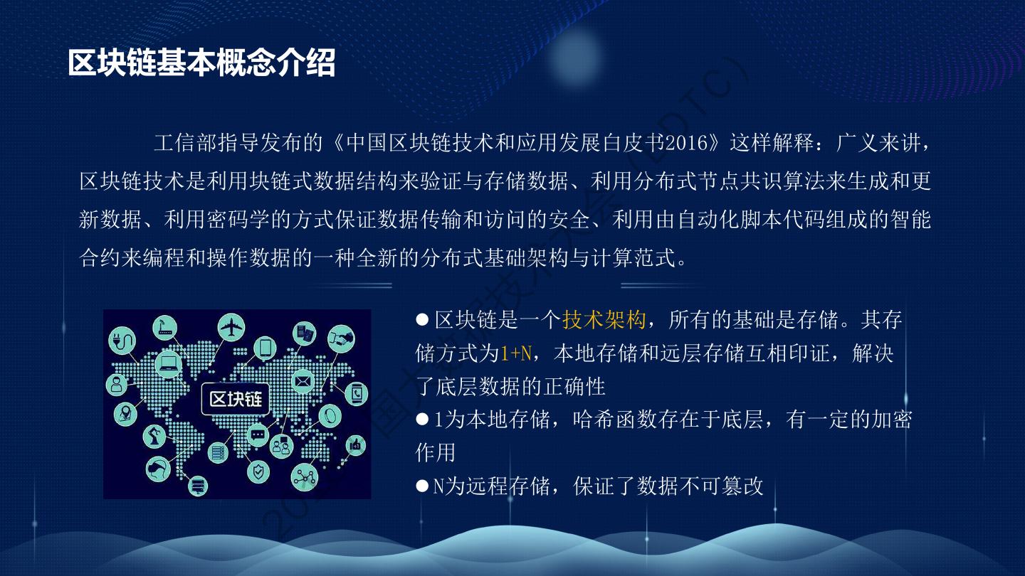 3 .区块链基本概念介绍 ) TC BD 工信部指导发布的《中国区块链技术和应用发展白皮书2016》这样解释:广义来讲, ( 区块链技术是利用块链式数据结构来验证与存储数据、利用分布式节点共识算法来生成和更 会 新数据、利用密码学的方式保证数据传输和访问的安全、利用由自动化脚本代码组成的智能 大 合约来编程和操作数据的一种全新的分布式基础架构与计算范式。 术 技 区块链是一个技术架构,所有的基础是存储。其存 据 储方式为1+N,本地存储和远层存储互相印证,解决 数 了底层数据的正确性 大 1为本地存储,哈希函数存在于底层,有一定的加密 国 中 作用 18 N为远程存储,保证了数据不可篡改 20