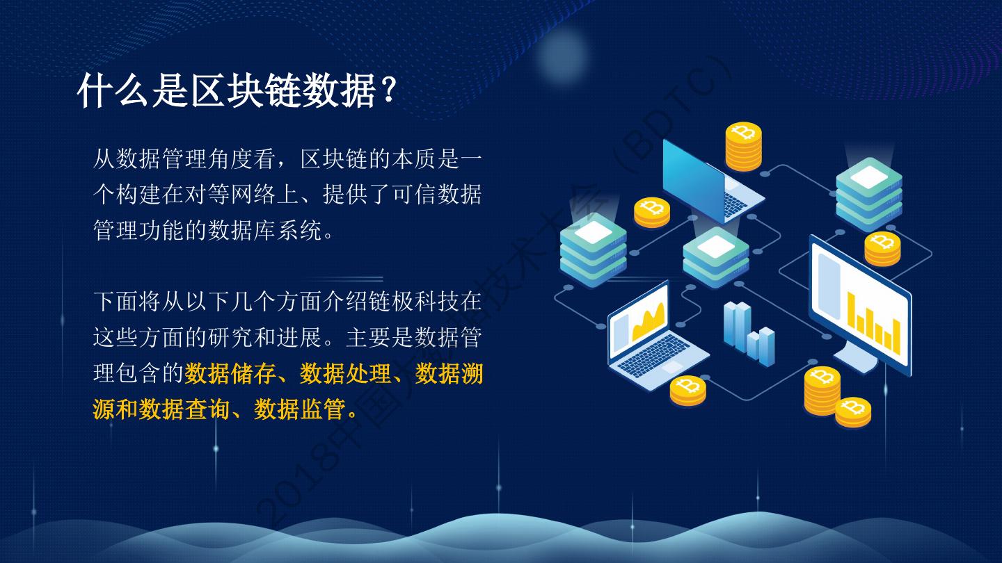 4 . ) 什么是区块链数据? TC BD 从数据管理角度看,区块链的本质是一 ( 个构建在对等网络上、提供了可信数据 会 管理功能的数据库系统。 大 术 技 下面将从以下几个方面介绍链极科技在 据 这些方面的研究和进展。主要是数据管 数 理包含的数据储存、数据处理、数据溯 大 源和数据查询、数据监管。 国 中 18 20
