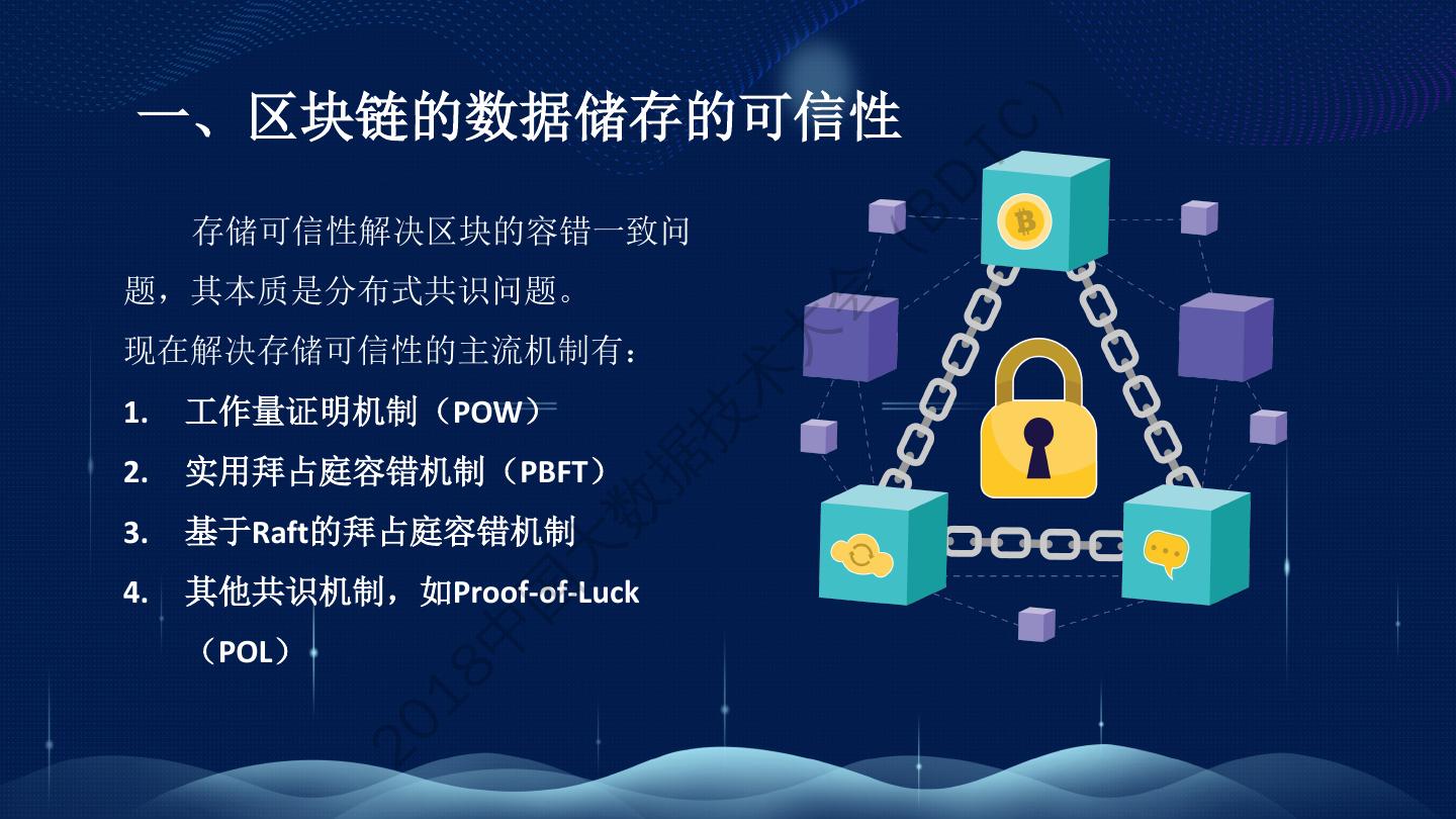 5 . ) 一、区块链的数据储存的可信性 TC BD 存储可信性解决区块的容错一致问 ( 题,其本质是分布式共识问题。 会 大 现在解决存储可信性的主流机制有: 术 1. 工作量证明机制(POW) 技 2. 据 实用拜占庭容错机制(PBFT) 数 3. 基于Raft的拜占庭容错机制 4. 大 其他共识机制,如Proof-of-Luck 国 中 (POL) 18 20