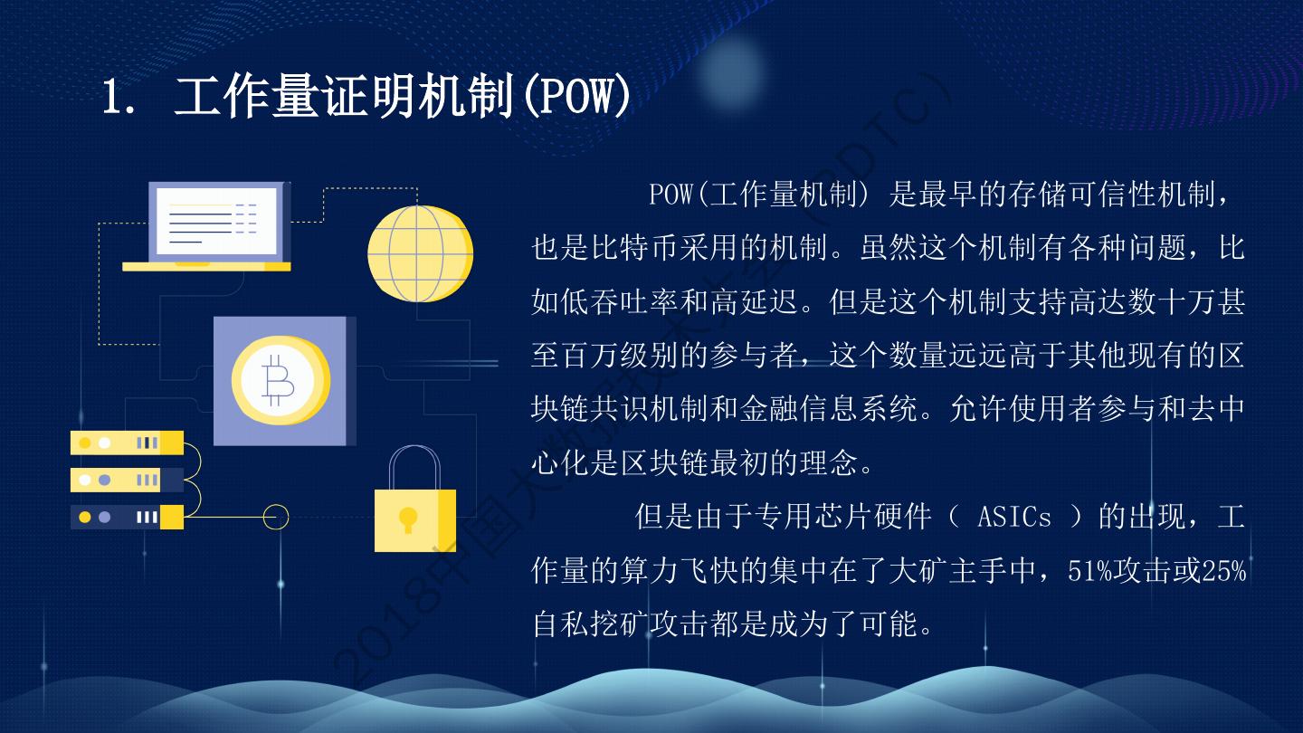 6 . ) 1. 工作量证明机制(POW) TC BD POW(工作量机制) 是最早的存储可信性机制, ( 也是比特币采用的机制。虽然这个机制有各种问题,比 会 如低吞吐率和高延迟。但是这个机制支持高达数十万甚 大 术 至百万级别的参与者,这个数量远远高于其他现有的区 技 块链共识机制和金融信息系统。允许使用者参与和去中 据 数 心化是区块链最初的理念。 大 但是由于专用芯片硬件( ASICs )的出现,工 国 作量的算力飞快的集中在了大矿主手中,51%攻击或25% 中 18 自私挖矿攻击都是成为了可能。 20