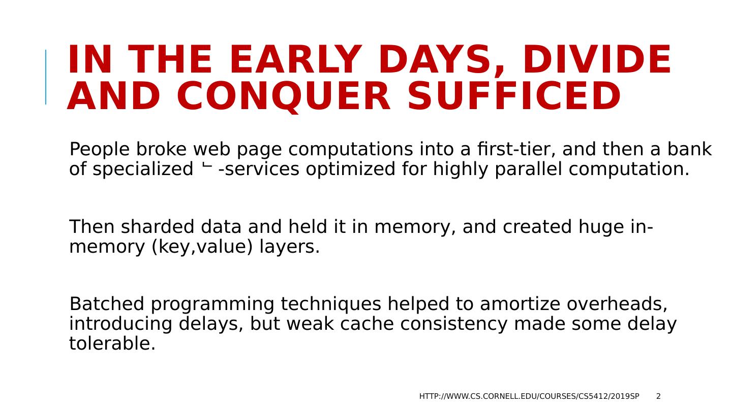 2 .In The early days, divide and Conquer Sufficed People broke web page computations into a first-tier, and then a bank of specialized -services optimized for highly parallel computation. Then sharded data and held it in memory, and created huge in-memory ( key,value ) layers. Batched programming techniques helped to amortize overheads, introducing delays, but weak cache consistency made some delay tolerable. http://www.cs.cornell.edu/courses/cs5412/2019sp 2