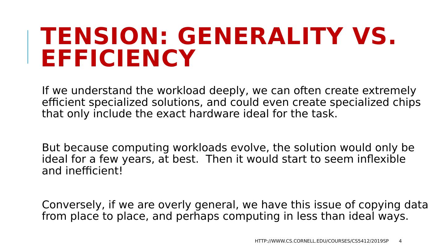 4 .Tension: Generality vs. Efficiency If we understand the workload deeply, we can often create extremely efficient specialized solutions, and could even create specialized chips that only include the exact hardware ideal for the task. But because computing workloads evolve, the solution would only be ideal for a few years, at best. Then it would start to seem inflexible and inefficient! Conversely, if we are overly general, we have this issue of copying data from place to place, and perhaps computing in less than ideal ways. http://www.cs.cornell.edu/courses/cs5412/2019sp 4