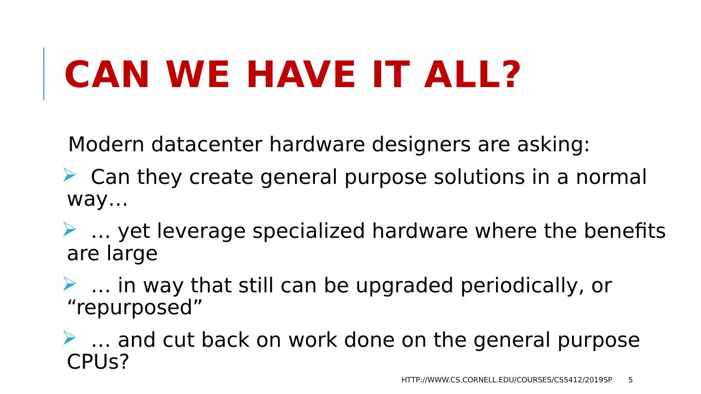 5 .Can we have it all? Modern datacenter hardware designers are asking: Can they create general purpose solutions in a normal way… … yet leverage specialized hardware where the benefits are large … in way that still can be upgraded periodically, or “repurposed” … and cut back on work done on the general purpose CPUs? http://www.cs.cornell.edu/courses/cs5412/2019sp 5