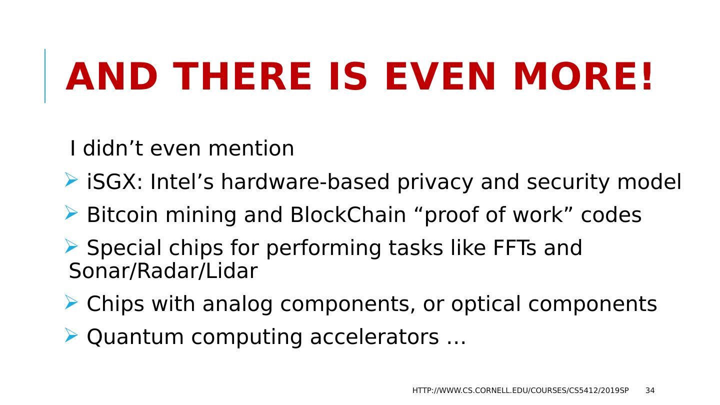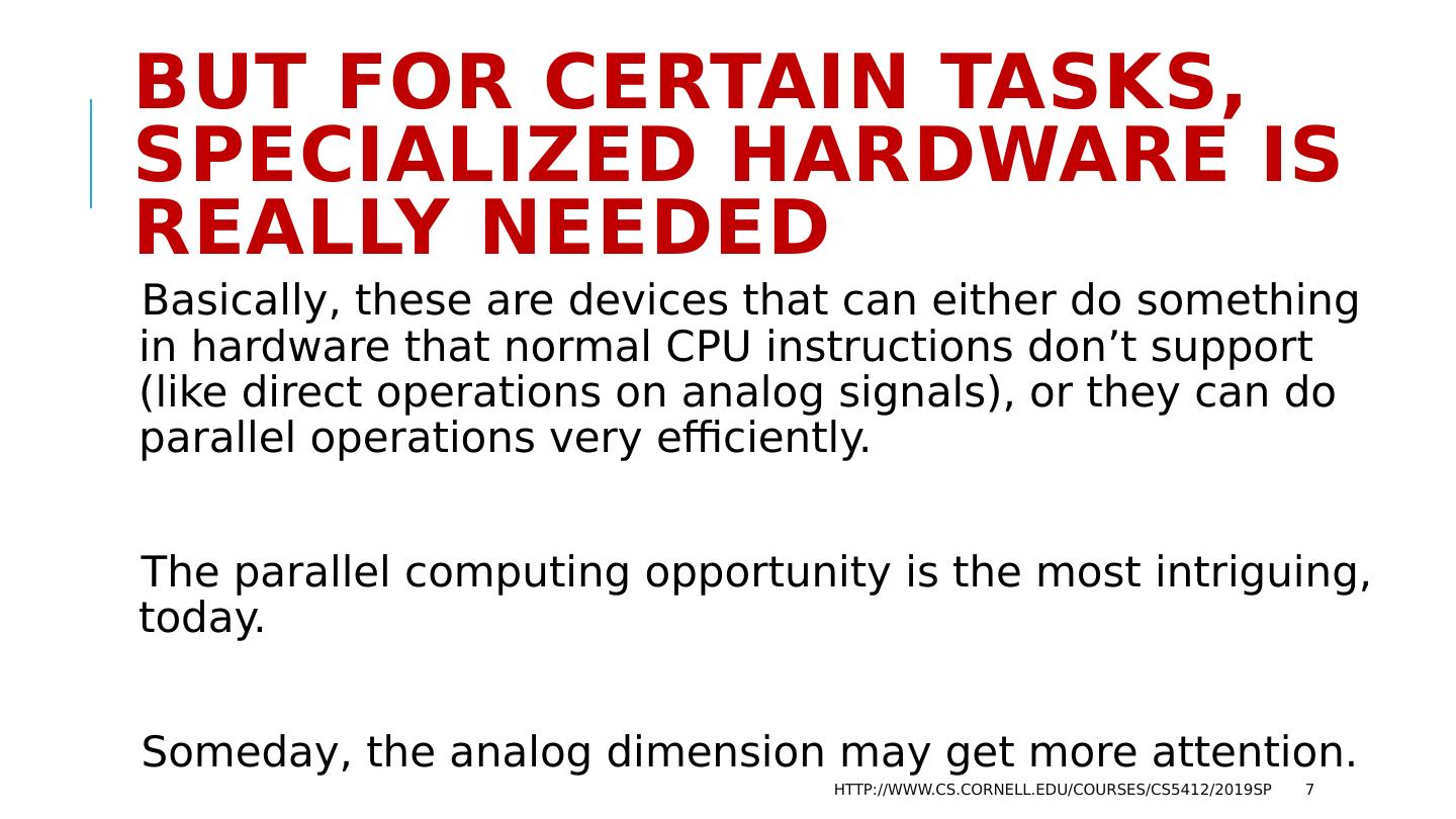7 .But for certain tasks, specialized hardware is really needed Basically, these are devices that can either do something in hardware that normal CPU instructions don’t support (like direct operations on analog signals), or they can do parallel operations very efficiently. The parallel computing opportunity is the most intriguing, today. Someday, the analog dimension may get more attention. http://www.cs.cornell.edu/courses/cs5412/2019sp 7