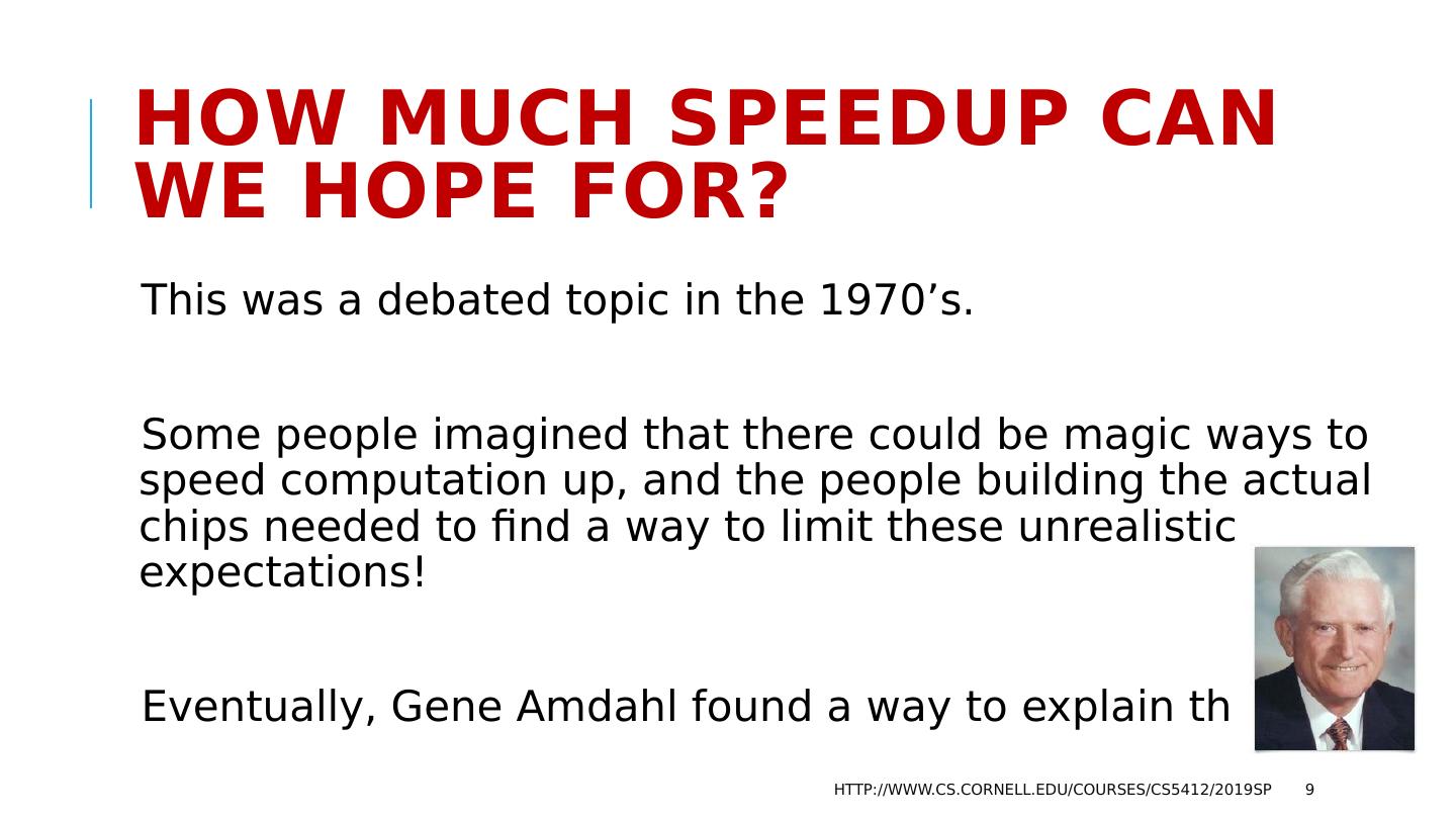 9 .How much speedup can we hope for? This was a debated topic in the 1970’s. Some people imagined that there could be magic ways to speed computation up, and the people building the actual chips needed to find a way to limit these unrealistic expectations! Eventually, Gene Amdahl found a way to explain the limits. http://www.cs.cornell.edu/courses/cs5412/2019sp 9