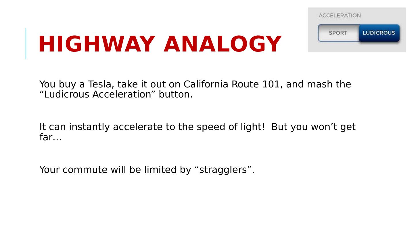 12 .Highway analogy You buy a Tesla, take it out on California Route 101, and mash the “Ludicrous Acceleration” button. It can instantly accelerate to the speed of light! But you won’t get far… Your commute will be limited by “stragglers”.