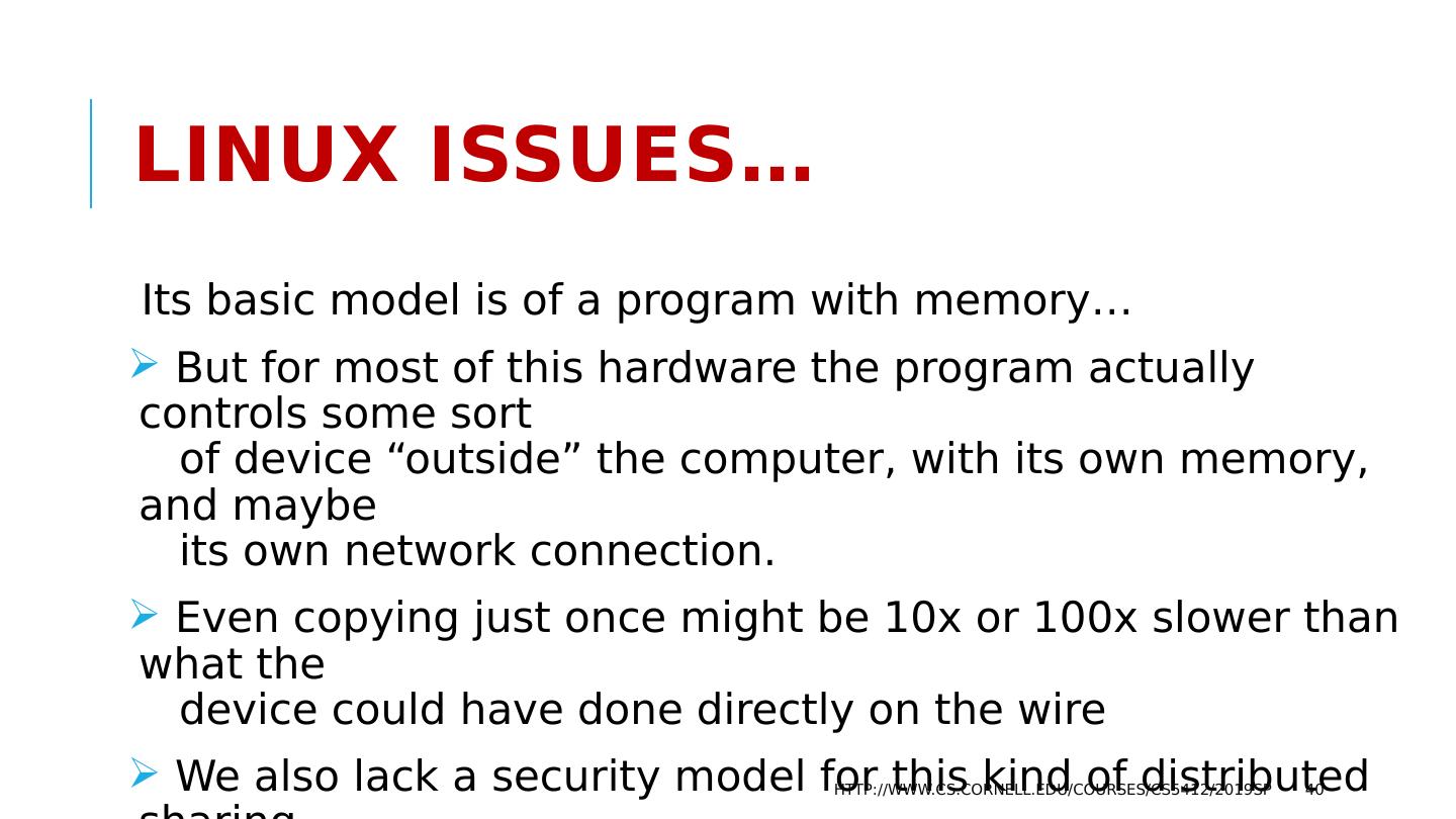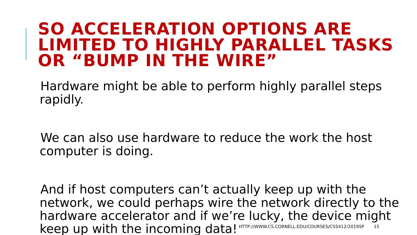 15 .So acceleration options are limited to highly parallel tasks or “bump in the wire” Hardware might be able to perform highly parallel steps rapidly. We can also use hardware to reduce the work the host computer is doing. And if host computers can’t actually keep up with the network, we could perhaps wire the network directly to the hardware accelerator and if we’re lucky, the device might keep up with the incoming data! http://www.cs.cornell.edu/courses/cs5412/2019sp 15