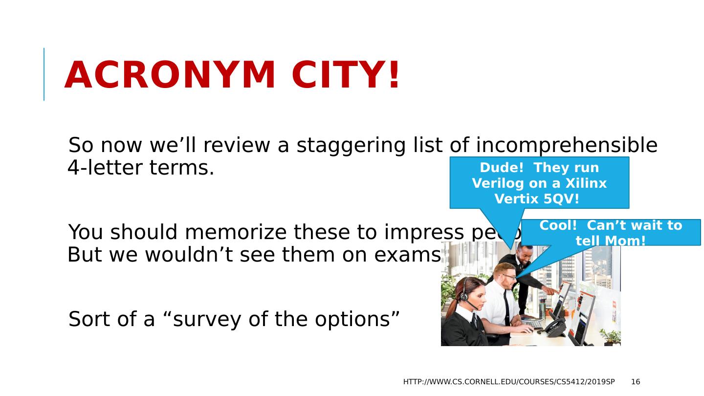 16 .Acronym City! So now we’ll review a staggering list of incomprehensible 4-letter terms. You should memorize these to impress people. But we wouldn’t see them on exams! Sort of a “survey of the options” http://www.cs.cornell.edu/courses/cs5412/2019sp 16 Dude! They run Verilog on a Xilinx Vertix 5QV! Cool! Can’t wait to tell Mom!