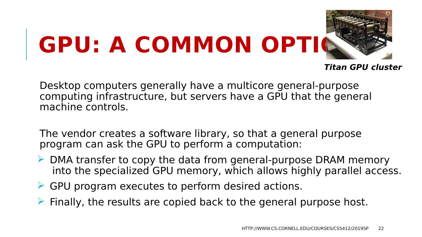 22 .GPU: A Common option Desktop computers generally have a multicore general-purpose computing infrastructure, but servers have a GPU that the general machine controls. The vendor creates a software library, so that a general purpose program can ask the GPU to perform a computation: DMA transfer to copy the data from general-purpose DRAM memory into the specialized GPU memory, which allows highly parallel access. GPU program executes to perform desired actions. Finally, the results are copied back to the general purpose host. http://www.cs.cornell.edu/courses/cs5412/2019sp 22 Titan GPU cluster