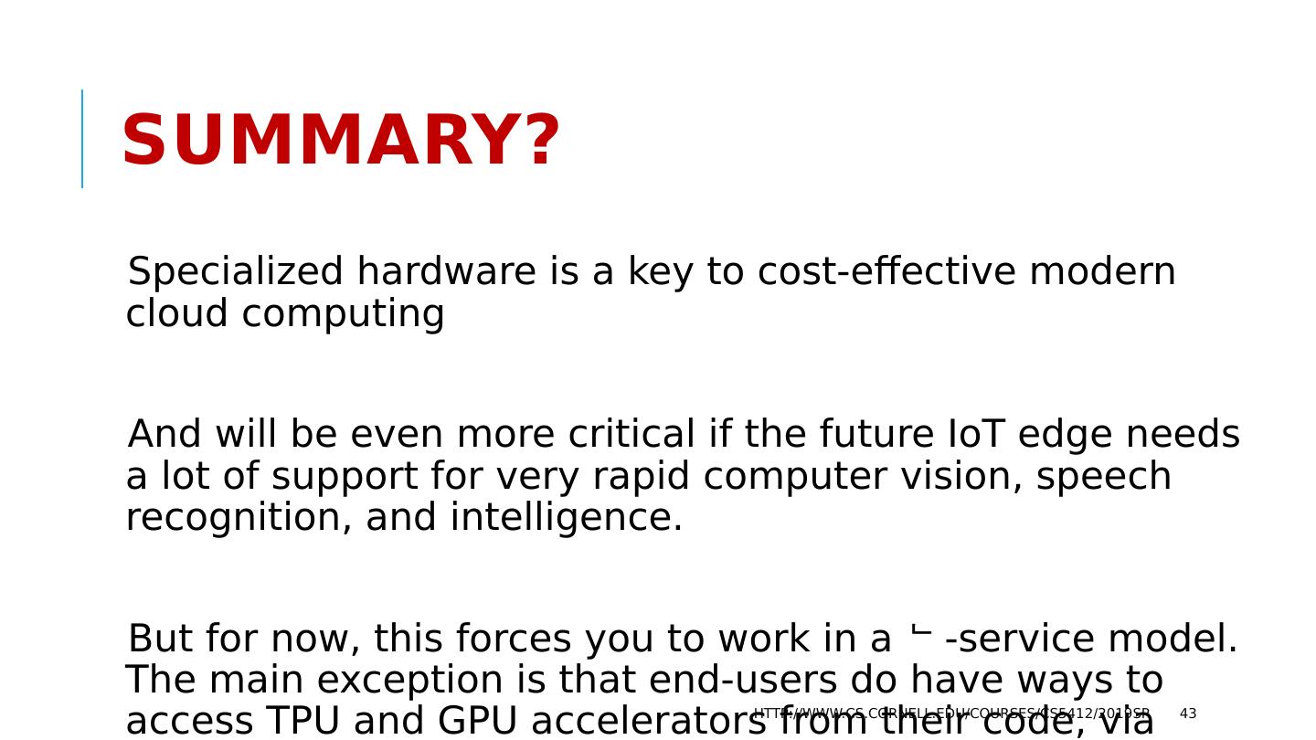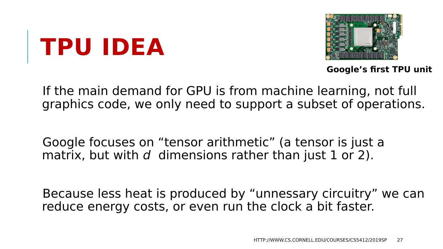 26 .“GPU For machine learning”? There has been more and more pressure to equip every computer in the cloud with a GPU, but this is very costly if those GPU units aren’t all in use. Still, many data centers take this approach. Google is betting that GPUs just aren’t cost-effective at scale and decided to strip the concept down to a minimum: TPUs == “Tensor Processing Units” http://www.cs.cornell.edu/courses/cs5412/2019sp 26