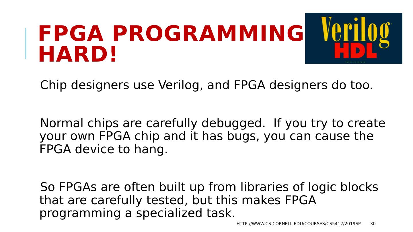 29 .Field Programmable Gate Arrays (FPGA) As you know, a CPU chip just maps instructions down to gate-level operations like AND, OR, XOR, NOT. Xilinx invented a way to take a chip and “download” a wiring diagram and a logic diagram to it. So you can “configure” your chip to have, say, an ARM or i86 processor on it. Of course that would be silly. But you can also design your own specialized chip, and in theory, it could do anything a GPU or TPU could do, or anything else, really. http://www.cs.cornell.edu/courses/cs5412/2019sp 29