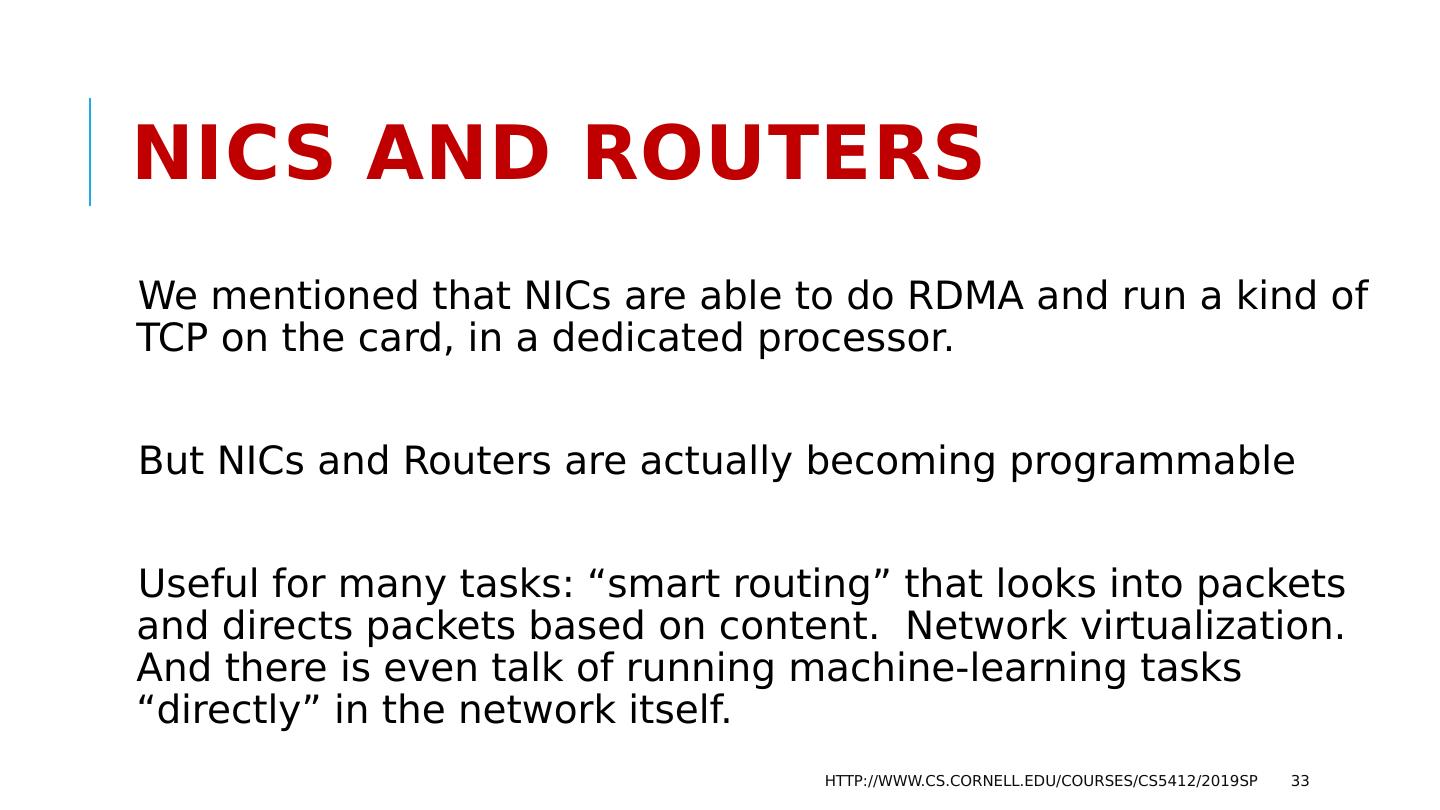 20 .Networks have evolved too The Network Interface Card (NIC) on your server now has a small operating system in it, and runs programs in C! (Written by the vendor) You can perform DMA transfers directly from machine to machine, not just from the network in and out of the machine as before. “Remote DMA” is like TCP (reliable, ordered, etc ) but the hardware does all the work. RDMA is way faster than TCP: we have RDMA at 200Gbps today, but the fastest TCP solutions are easily 4x or 6x slower. http://www.cs.cornell.edu/courses/cs5412/2019sp 20