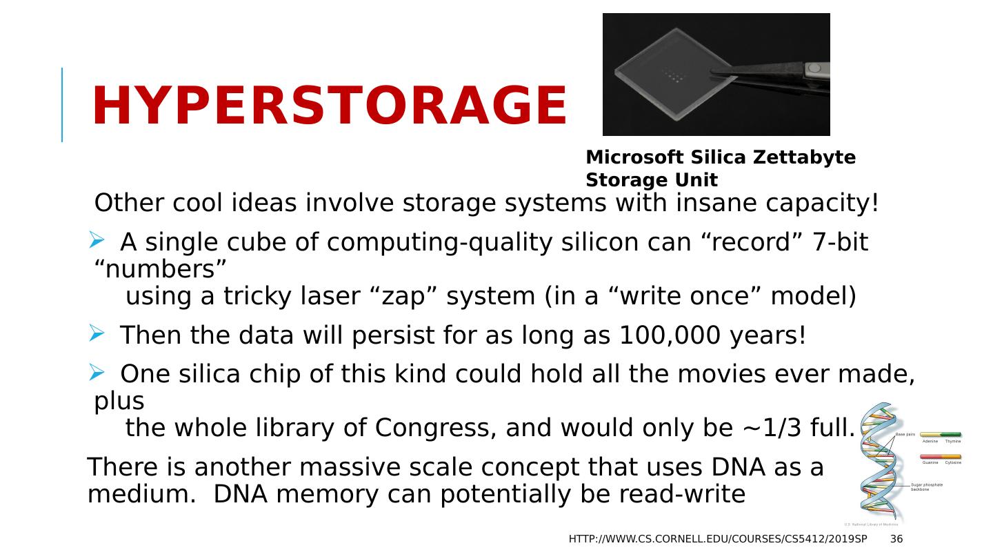 19 .Storage devices are improving too… Disk I/O (even with flash SSD drives) often limits performance. New “non-volatile memory” options like Intel’s Optane NVMe are much faster. They use “phase change memory” technology. Today: NVMe is the new flash (somewhat expensive, but very fast) Flash is the new disk (slow, but cheaper and more capacity) Disk is the new tape (even slower, but massive capacity) http://www.cs.cornell.edu/courses/cs5412/2019sp 19