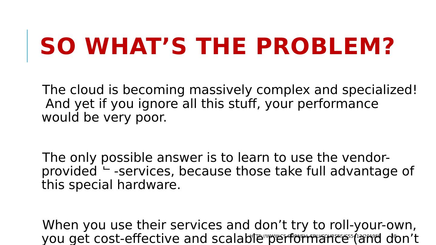 8 .Accelerators: The Secret to Azure Performance! It is important to understand how vital these accelerators are in the cloud. People who pretend the cloud is just a rent-a-server model lose access to the accelerators (the vendors all have security features that block you). So because the accelerators are so amazing, you must use -services! http://www.cs.cornell.edu/courses/cs5412/2019sp 8