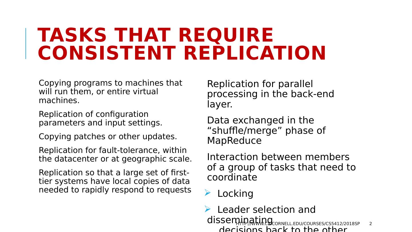 2 .Tasks that require Consistent Replication Copying programs to machines that will run them, or entire virtual machines. Replication of configuration parameters and input settings. Copying patches or other updates. Replication for fault-tolerance, within the datacenter or at geographic scale. Replication so that a large set of first-tier systems have local copies of data needed to rapidly respond to requests Replication for parallel processing in the back-end layer. Data exchanged in the “shuffle/merge” phase of MapReduce Interaction between members of a group of tasks that need to coordinate Locking Leader selection and disseminating decisions back to the other members Barrier coordination http://www.cs.cornell.edu/courses/cs5412/2018sp 2