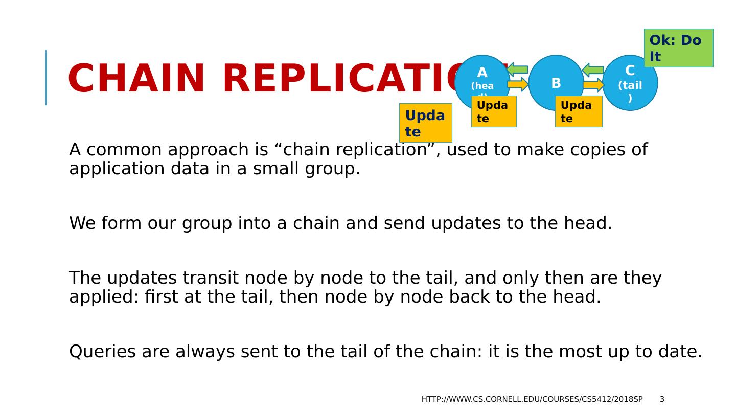 3 .Chain Replication A common approach is “chain replication”, used to make copies of application data in a small group. We form our group into a chain and send updates to the head. The updates transit node by node to the tail, and only then are they applied: first at the tail, then node by node back to the head. Queries are always sent to the tail of the chain: it is the most up to date. http://www.cs.cornell.edu/courses/cs5412/2018sp 3 A (head) B C (tail) Update Ok: Do It Update Update