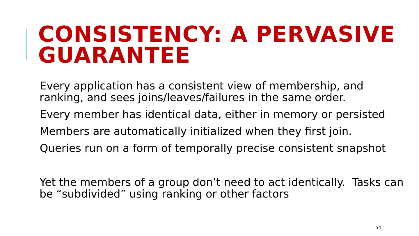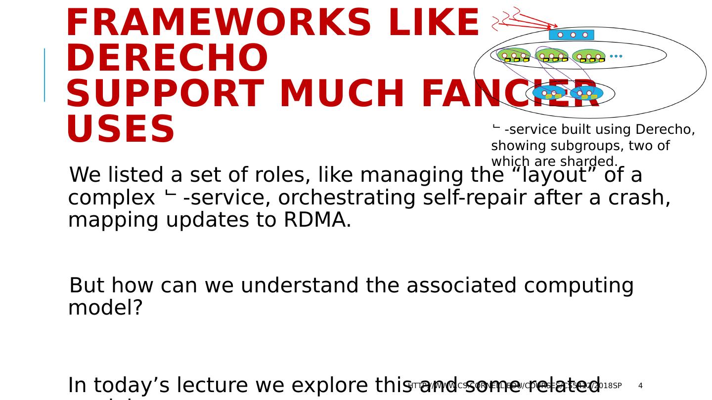 4 .Frameworks like Derecho support much fancier uses We listed a set of roles, like managing the “layout” of a complex -service, orchestrating self-repair after a crash, mapping updates to RDMA. But how can we understand the associated computing model? In today’s lecture we explore this and some related models. http://www.cs.cornell.edu/courses/cs5412/2018sp 4 -service built using Derecho, showing subgroups, two of which are sharded .