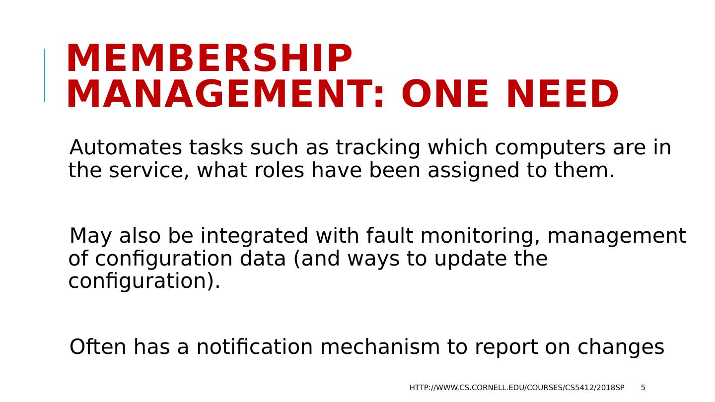 5 .Membership Management: One need Automates tasks such as tracking which computers are in the service, what roles have been assigned to them. May also be integrated with fault monitoring, management of configuration data (and ways to update the configuration). Often has a notification mechanism to report on changes http://www.cs.cornell.edu/courses/cs5412/2018sp 5