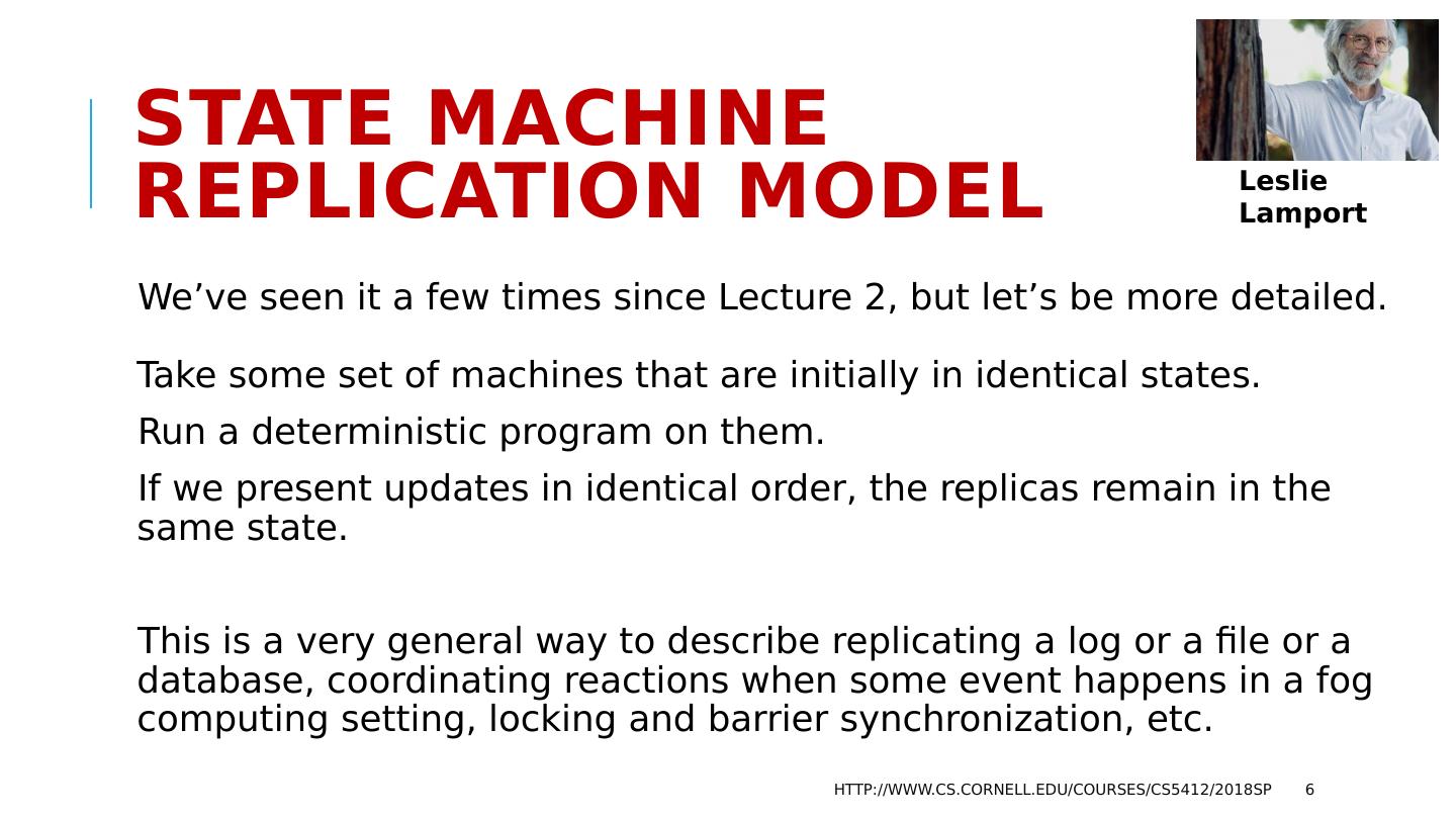 6 .State Machine Replication Model We’ve seen it a few times since Lecture 2, but let’s be more detailed. Take some set of machines that are initially in identical states. Run a deterministic program on them. If we present updates in identical order, the replicas remain in the same state. This is a very general way to describe replicating a log or a file or a database, coordinating reactions when some event happens in a fog computing setting, locking and barrier synchronization, etc. http://www.cs.cornell.edu/courses/cs5412/2018sp 6 Leslie Lamport