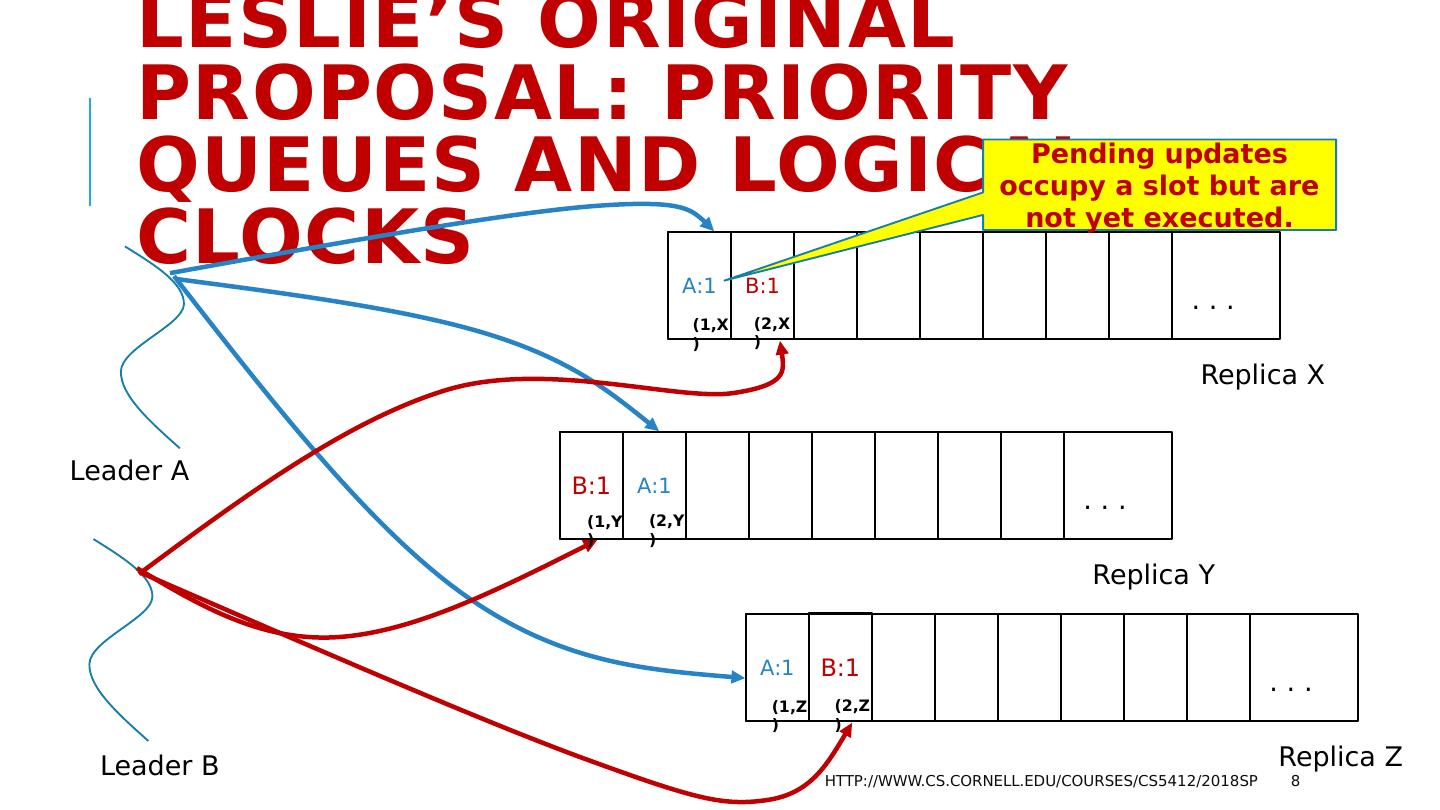 8 .Leslie’s original proposal: Priority Queues and Logical Clocks http://www.cs.cornell.edu/courses/cs5412/2018sp 8 Leader A Leader B A:1 B:1 . . . Replica X B:1 A:1 . . . Replica Y A:1 B:1 . . . Replica Z (1,X) (2,X) (1,Y) (2,Y) (1,Z) (2,Z) Pending updates occupy a slot but are not yet executed.
