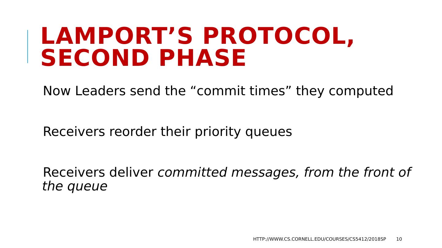 10 .Lamport’s protocol, second phase Now Leaders send the “commit times” they computed Receivers reorder their priority queues Receivers deliver committed messages, from the front of the queue http://www.cs.cornell.edu/courses/cs5412/2018sp 10