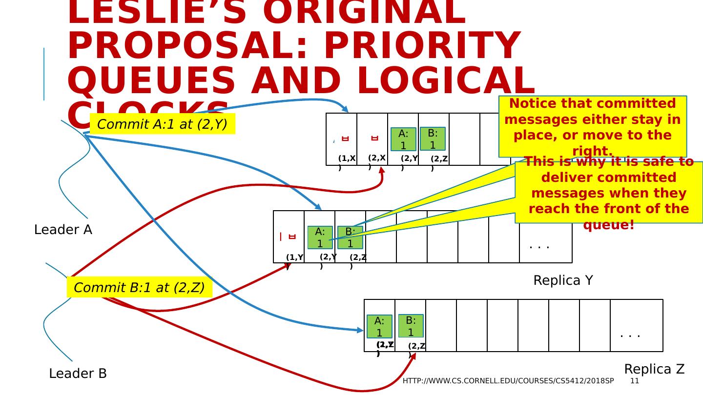 9 .Lamport’s rule: Leader sends proposed message. Receivers timestamp the message with a logical clock, insert to a priority queue and reply with (timestamp, receiver-id). For example: A:1 was put into slots {(1,X), (2,Y), (1,Z)} B:1 was put into slots {(2,X), (1,Y), (2,Z)} Leaders now compute the maximum by timestamp, breaking ties with ID. http://www.cs.cornell.edu/courses/cs5412/2018sp 9