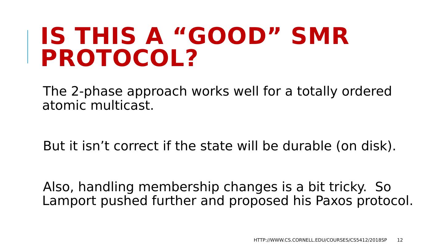 12 .Is this a “good” SMR protocol? The 2-phase approach works well for a totally ordered atomic multicast. But it isn’t correct if the state will be durable (on disk). Also, handling membership changes is a bit tricky. So Lamport pushed further and proposed his Paxos protocol. http://www.cs.cornell.edu/courses/cs5412/2018sp 12
