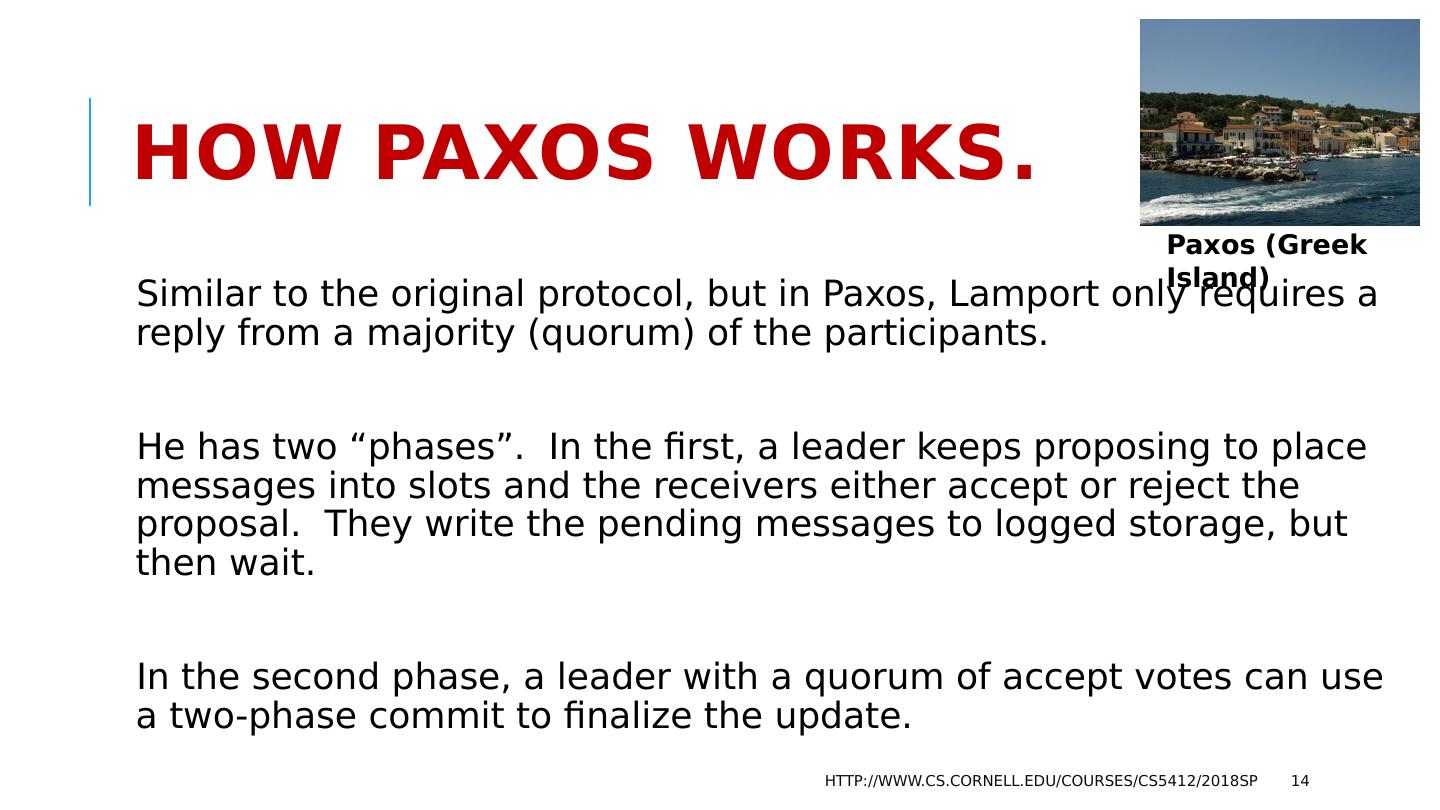 14 .How Paxos works. Similar to the original protocol, but in Paxos , Lamport only requires a reply from a majority (quorum) of the participants. He has two “phases”. In the first, a leader keeps proposing to place messages into slots and the receivers either accept or reject the proposal. They write the pending messages to logged storage, but then wait. In the second phase, a leader with a quorum of accept votes can use a two-phase commit to finalize the update. http://www.cs.cornell.edu/courses/cs5412/2018sp 14 Paxos (Greek Island)