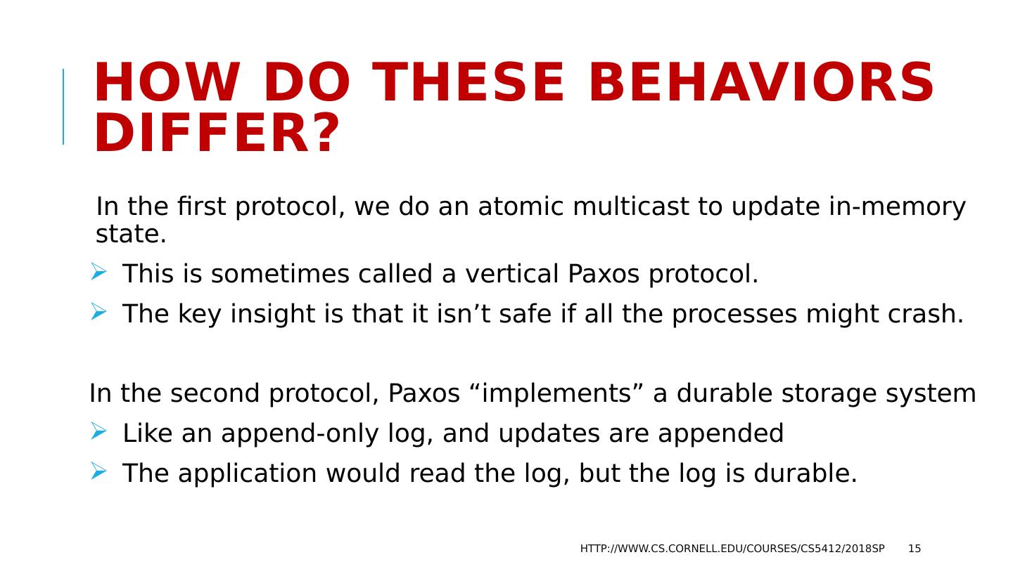 15 .How do these behaviors differ? In the first protocol, we do an atomic multicast to update in-memory state. This is sometimes called a vertical Paxos protocol. The key insight is that it isn’t safe if all the processes might crash. In the second protocol, Paxos “implements” a durable storage system Like an append-only log, and updates are appended The application would read the log, but the log is durable. http://www.cs.cornell.edu/courses/cs5412/2018sp 15