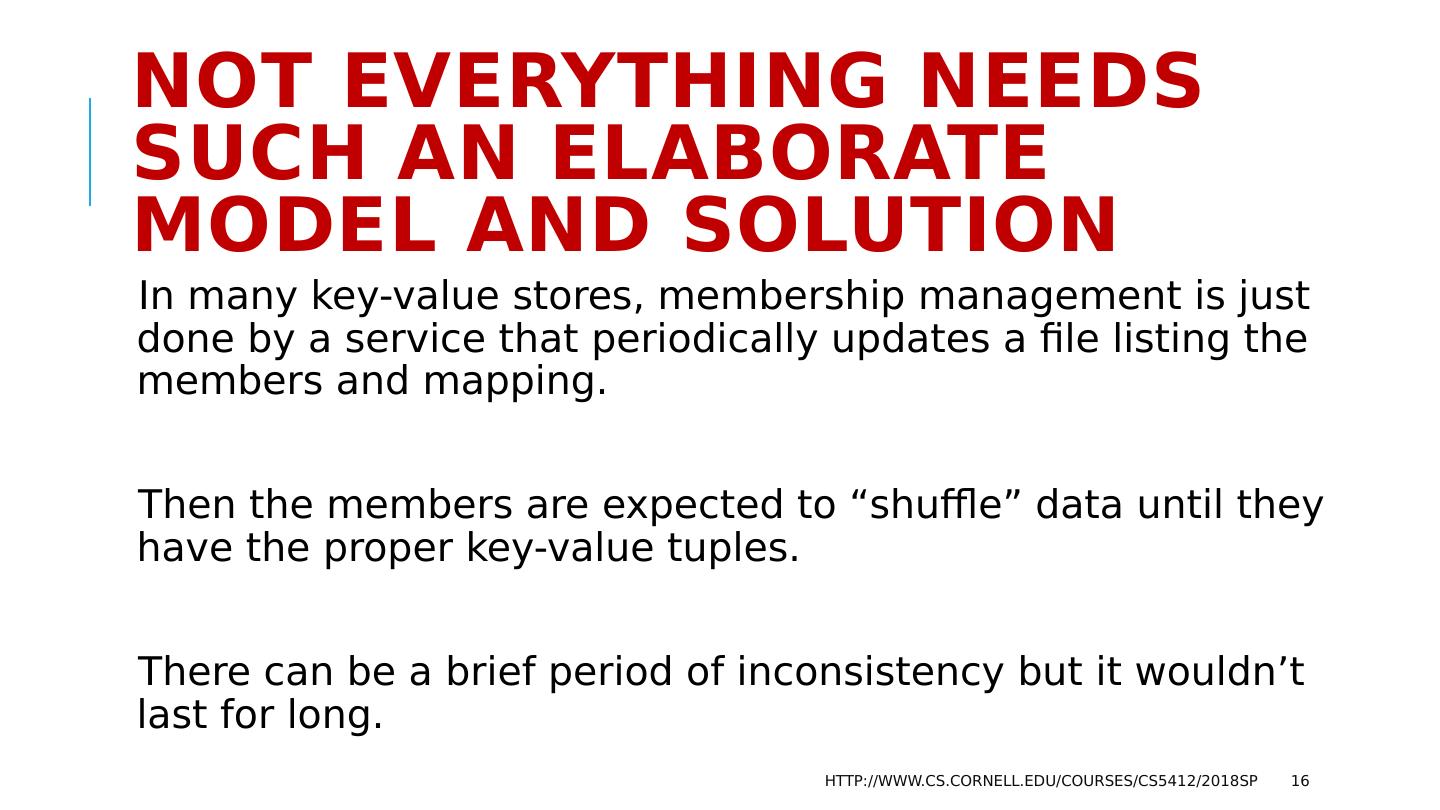 16 .Not everything needs such an elaborate model and solution In many key-value stores, membership management is just done by a service that periodically updates a file listing the members and mapping. Then the members are expected to “shuffle” data until they have the proper key-value tuples. There can be a brief period of inconsistency but it wouldn’t last for long. http://www.cs.cornell.edu/courses/cs5412/2018sp 16