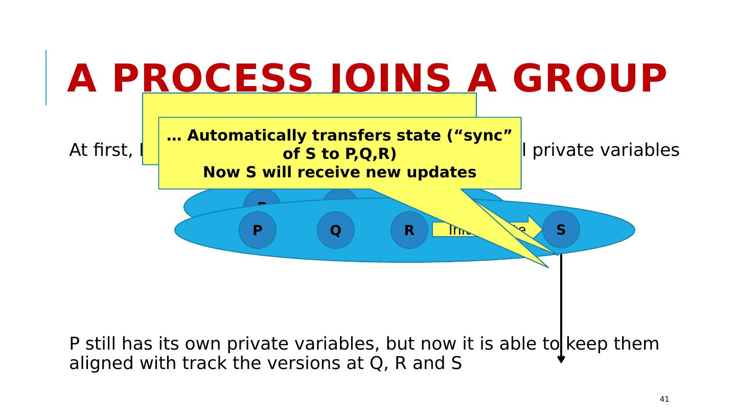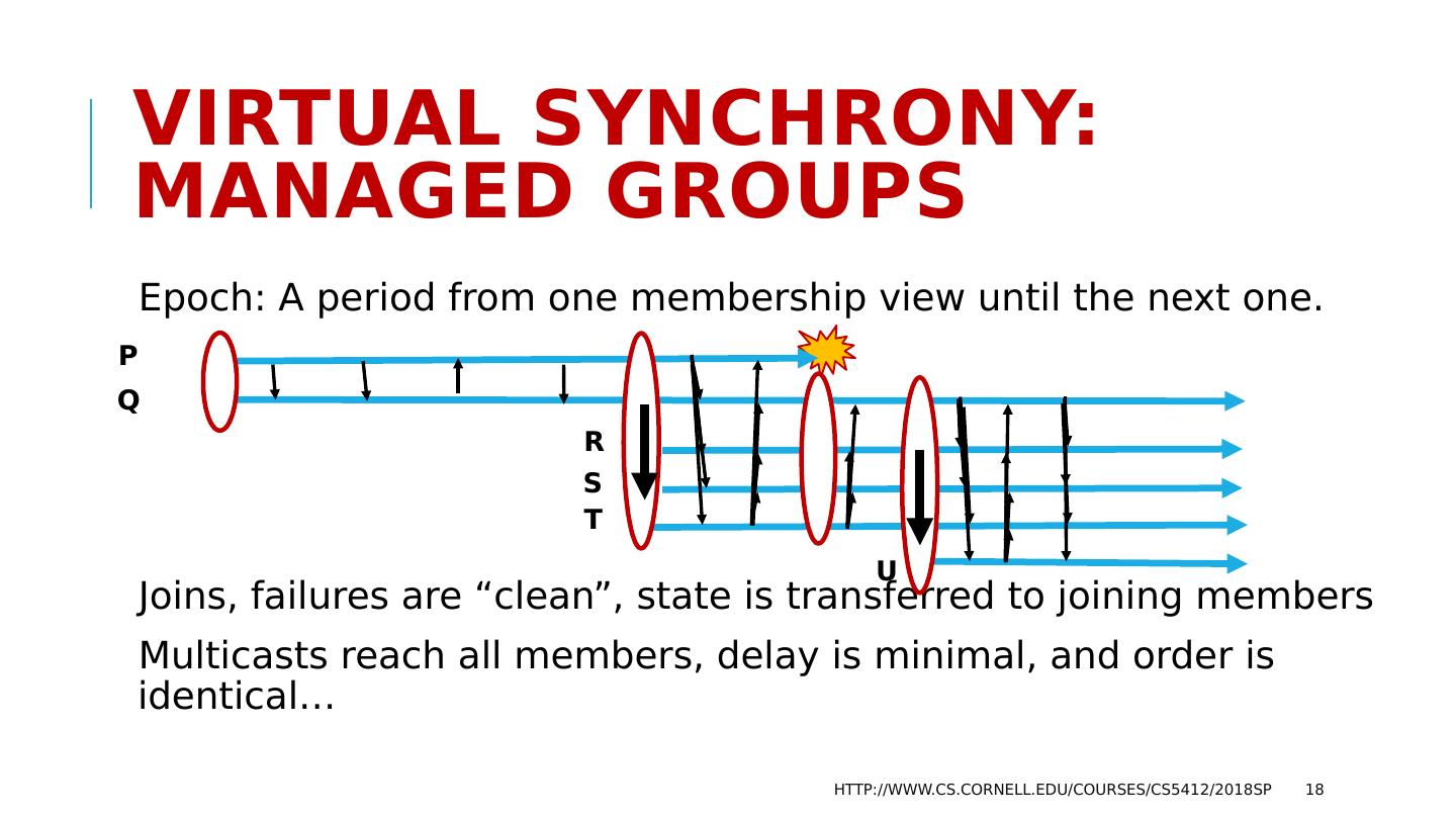 18 .Virtual synchrony: Managed Groups Epoch: A period from one membership view until the next one. Joins, failures are “clean”, state is transferred to joining members Multicasts reach all members, delay is minimal, and order is identical… http://www.cs.cornell.edu/courses/cs5412/2018sp 18 P Q R S T U