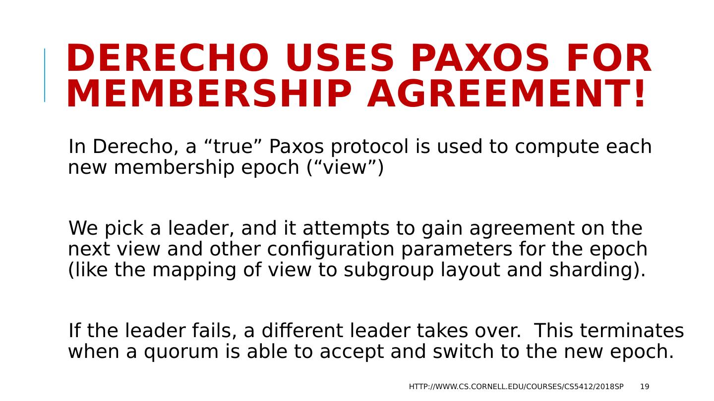 19 .Derecho uses Paxos for Membership Agreement! In Derecho, a “true” Paxos protocol is used to compute each new membership epoch (“view”) We pick a leader, and it attempts to gain agreement on the next view and other configuration parameters for the epoch (like the mapping of view to subgroup layout and sharding ). If the leader fails, a different leader takes over. This terminates when a quorum is able to accept and switch to the new epoch. http://www.cs.cornell.edu/courses/cs5412/2018sp 19