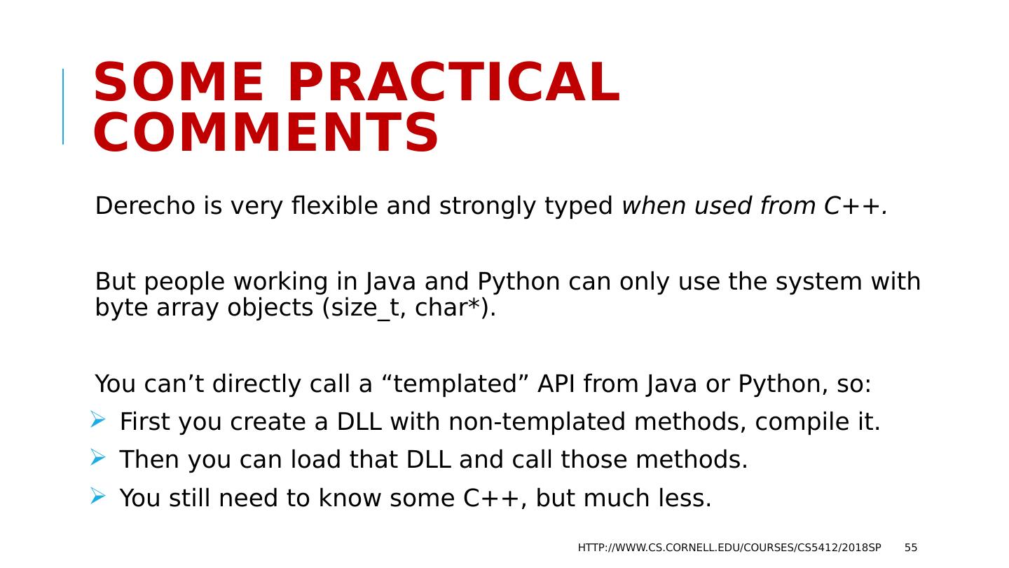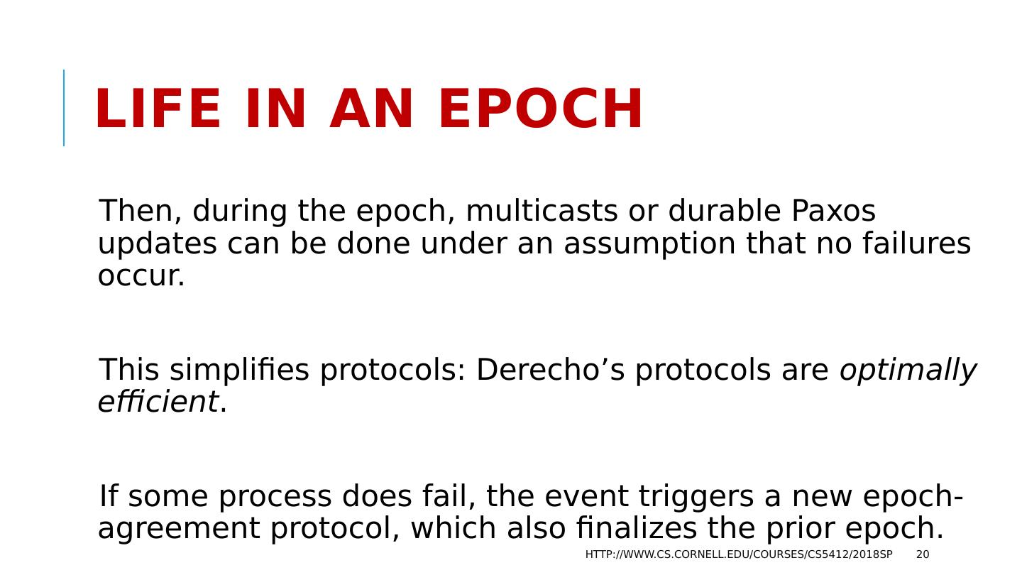 20 .Life in an Epoch Then, during the epoch, multicasts or durable Paxos updates can be done under an assumption that no failures occur. This simplifies protocols: Derecho’s protocols are optimally efficient . If some process does fail, the event triggers a new epoch-agreement protocol, which also finalizes the prior epoch. http://www.cs.cornell.edu/courses/cs5412/2018sp 20