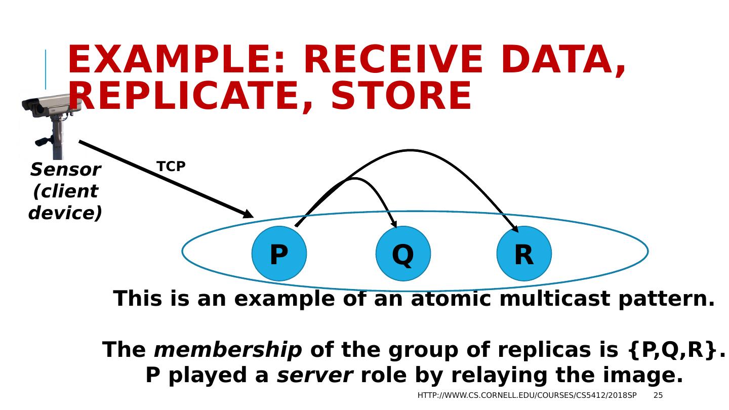 25 .Example: Receive data, replicate, store http://www.cs.cornell.edu/courses/cs5412/2018sp 25 Sensor (client device) P Q R This is an example of an atomic multicast pattern. The membership of the group of replicas is {P,Q,R}. P played a server role by relaying the image. TCP