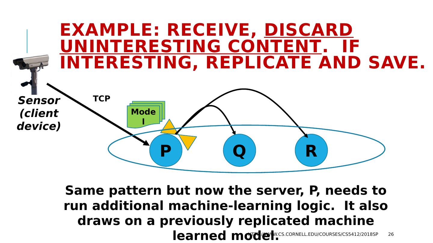 26 .Example: Receive, Discard uninteresting content . If interesting, replicate and save. http://www.cs.cornell.edu/courses/cs5412/2018sp 26 Sensor (client device) Same pattern but now the server, P, needs to run additional machine-learning logic. It also draws on a previously replicated machine learned model. TCP Model P Q R