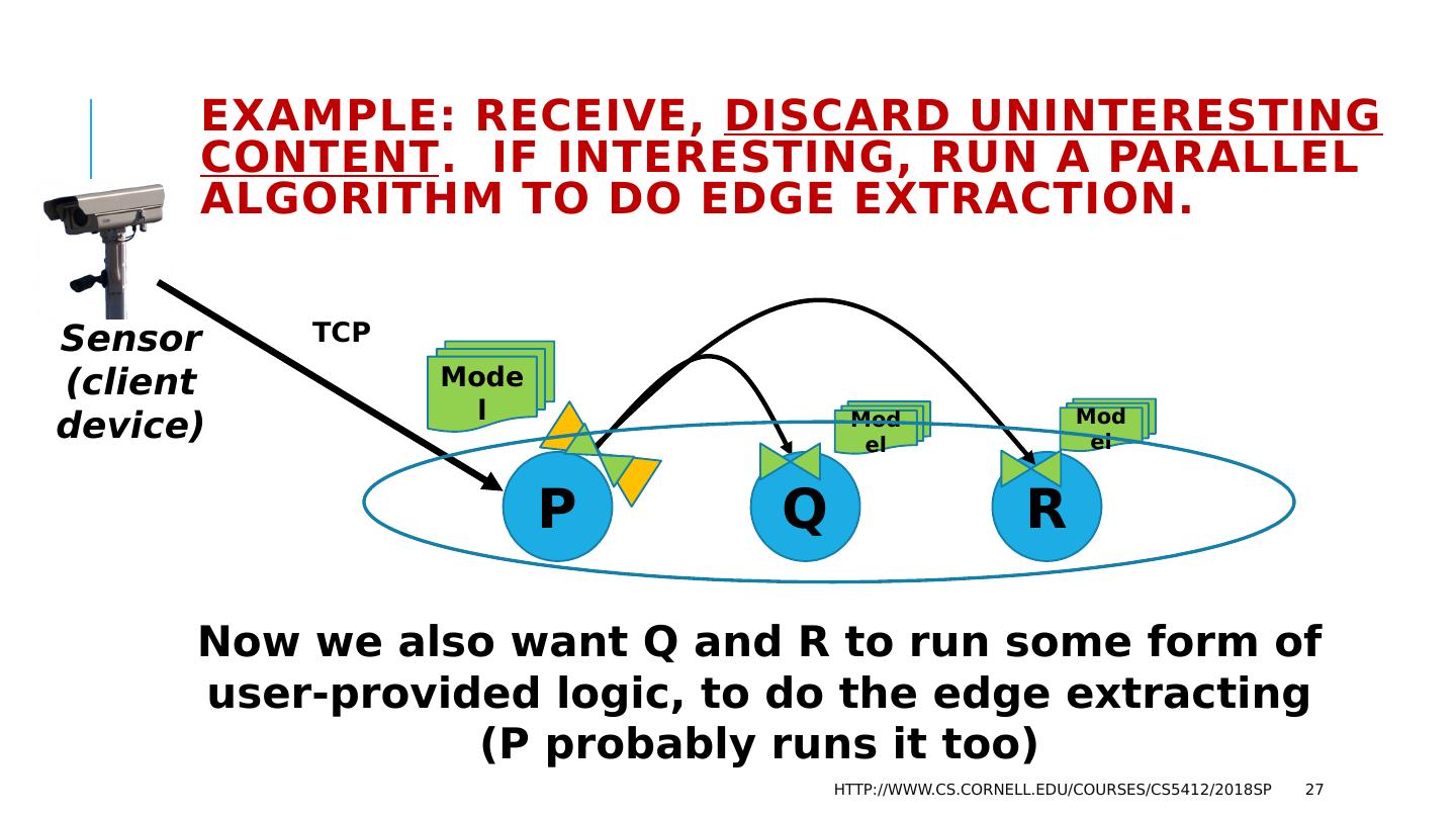27 .Example: Receive, Discard uninteresting content . If interesting, Run a parallel algorithm to do edge extraction. http://www.cs.cornell.edu/courses/cs5412/2018sp 27 Sensor (client device) Now we also want Q and R to run some form of user-provided logic, to do the edge extracting (P probably runs it too) TCP Model P Q R Model Model