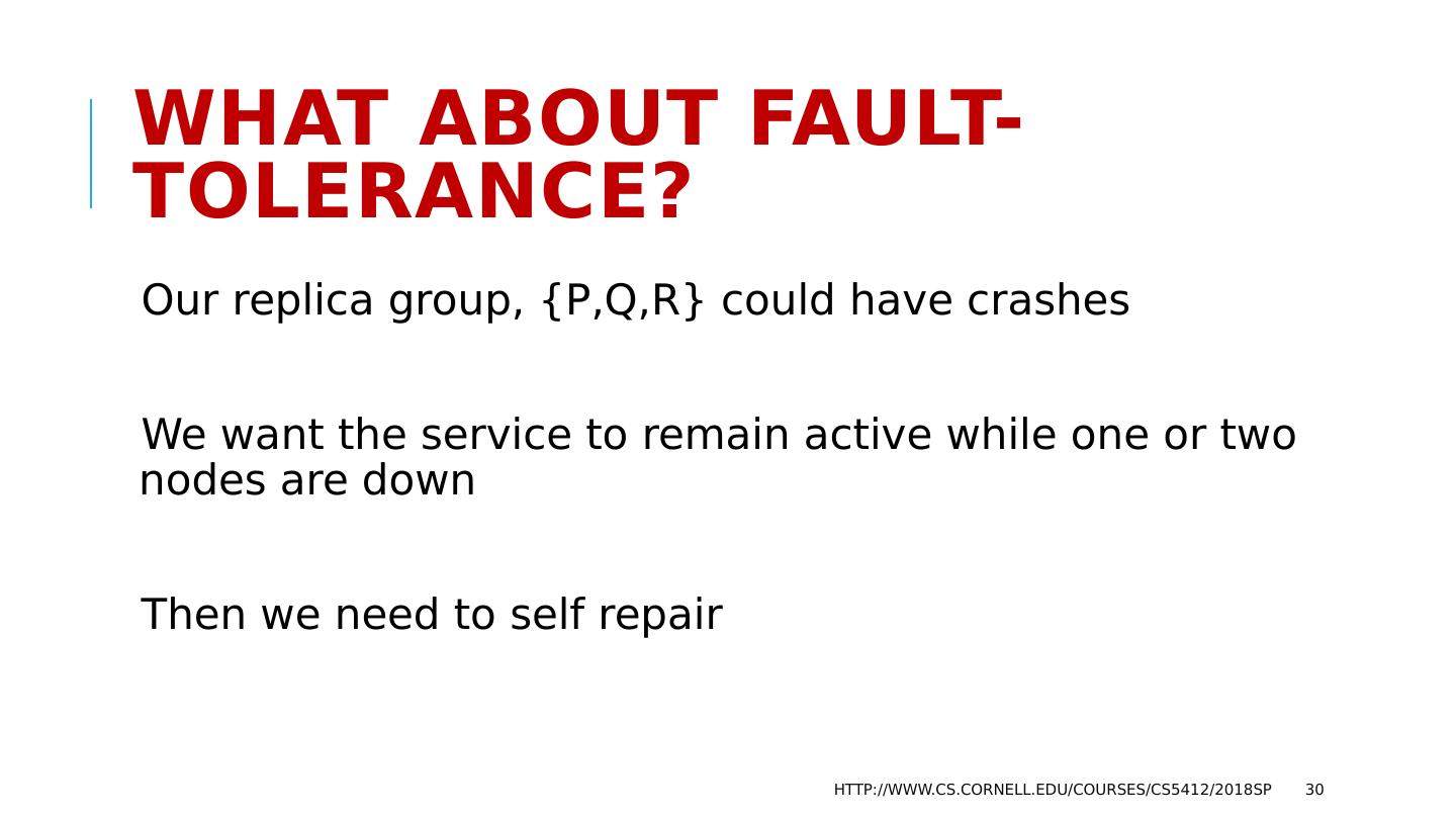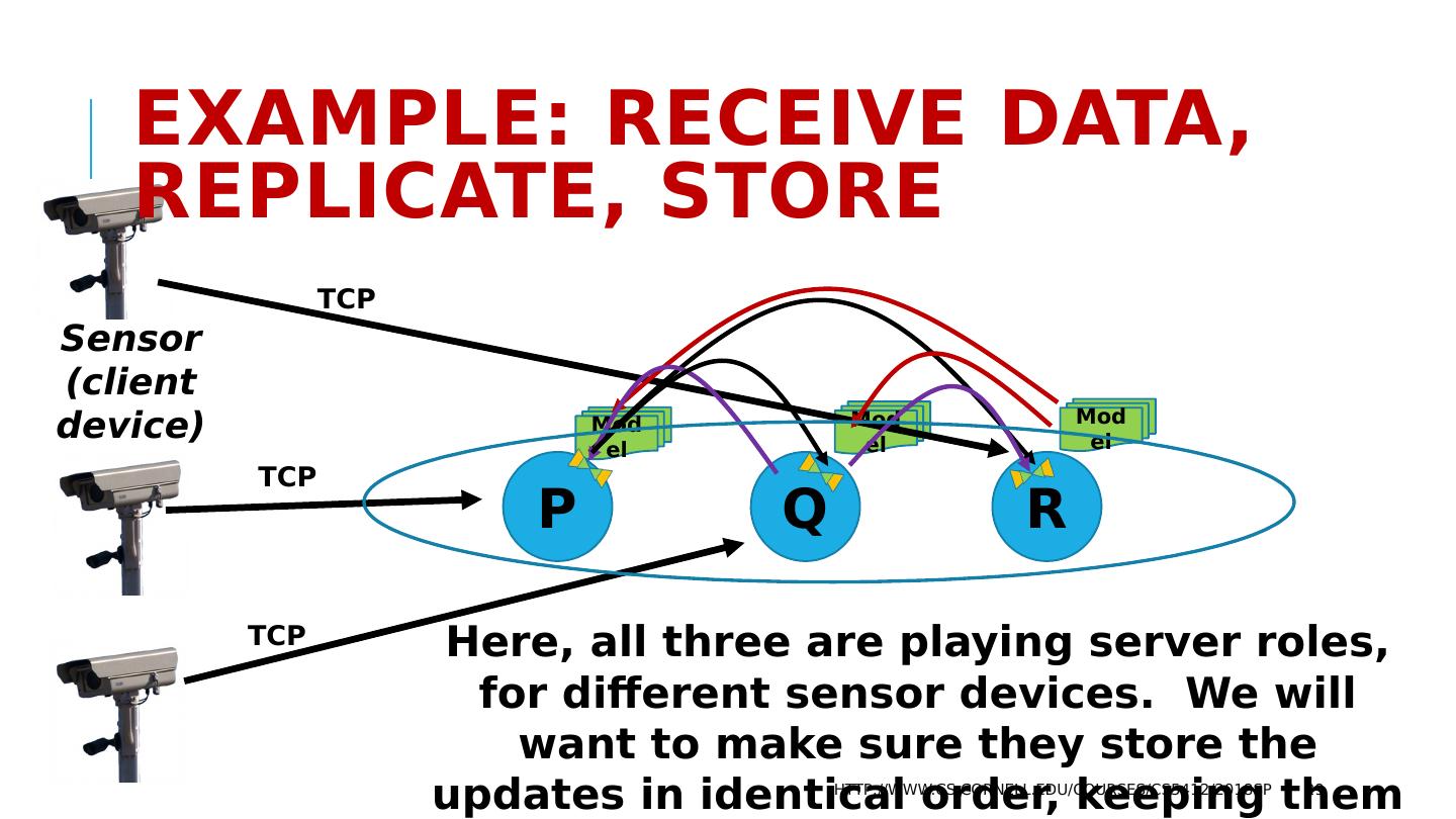 29 .Model Model Model Example: Receive data, replicate, store http://www.cs.cornell.edu/courses/cs5412/2018sp 29 Sensor (client device) P Q R TCP TCP TCP Here, all three are playing server roles, for different sensor devices. We will want to make sure they store the updates in identical order, keeping them consistent.