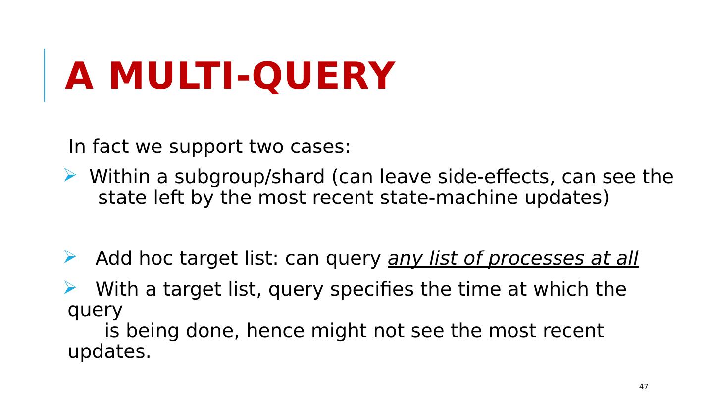 21 .Multicasts versus Paxos For a virtual synchrony multicast, a totally-ordered in-memory message triggers a state machine update. The state itself lives in memory. With durable Paxos , state lives in a file or append-only log, on disk. Here because the state is non-volatile, even a failure can’t cause it to be lost. In both cases, if a process joins a group, state transfer is used to initialize it. http://www.cs.cornell.edu/courses/cs5412/2018sp 21