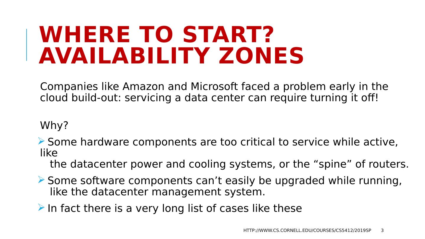 3 .Where to start? Availability Zones Companies like Amazon and Microsoft faced a problem early in the cloud build-out: servicing a data center can require turning it off! Why? Some hardware components are too critical to service while active, like the datacenter power and cooling systems, or the “spine” of routers. Some software components can’t easily be upgraded while running, like the datacenter management system. In fact there is a very long list of cases like these http://www.cs.cornell.edu/courses/cs5412/2019sp 3