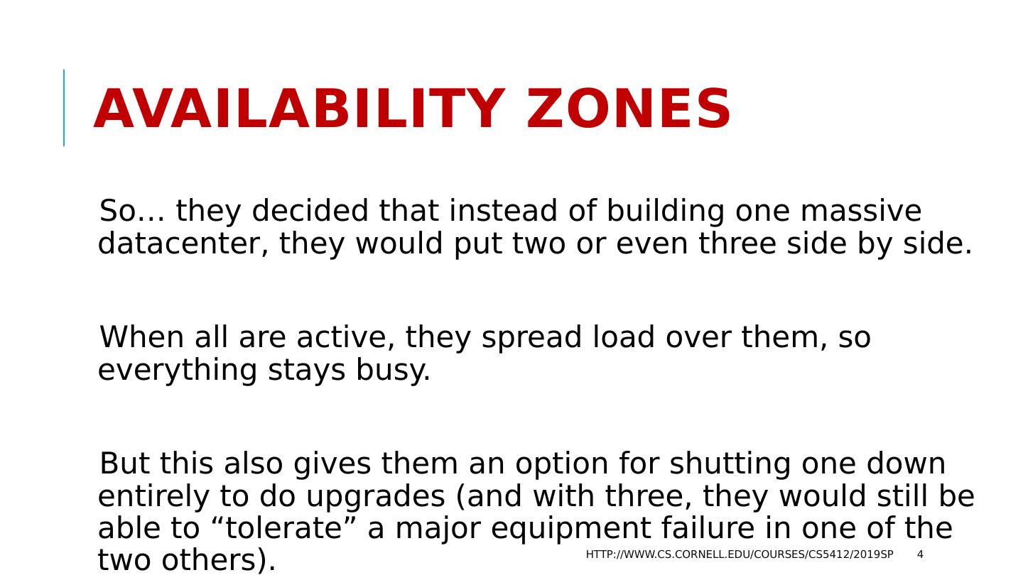4 .Availability zones So… they decided that instead of building one massive datacenter, they would put two or even three side by side. When all are active, they spread load over them, so everything stays busy. But this also gives them an option for shutting one down entirely to do upgrades (and with three, they would still be able to “tolerate” a major equipment failure in one of the two others). http://www.cs.cornell.edu/courses/cs5412/2019sp 4