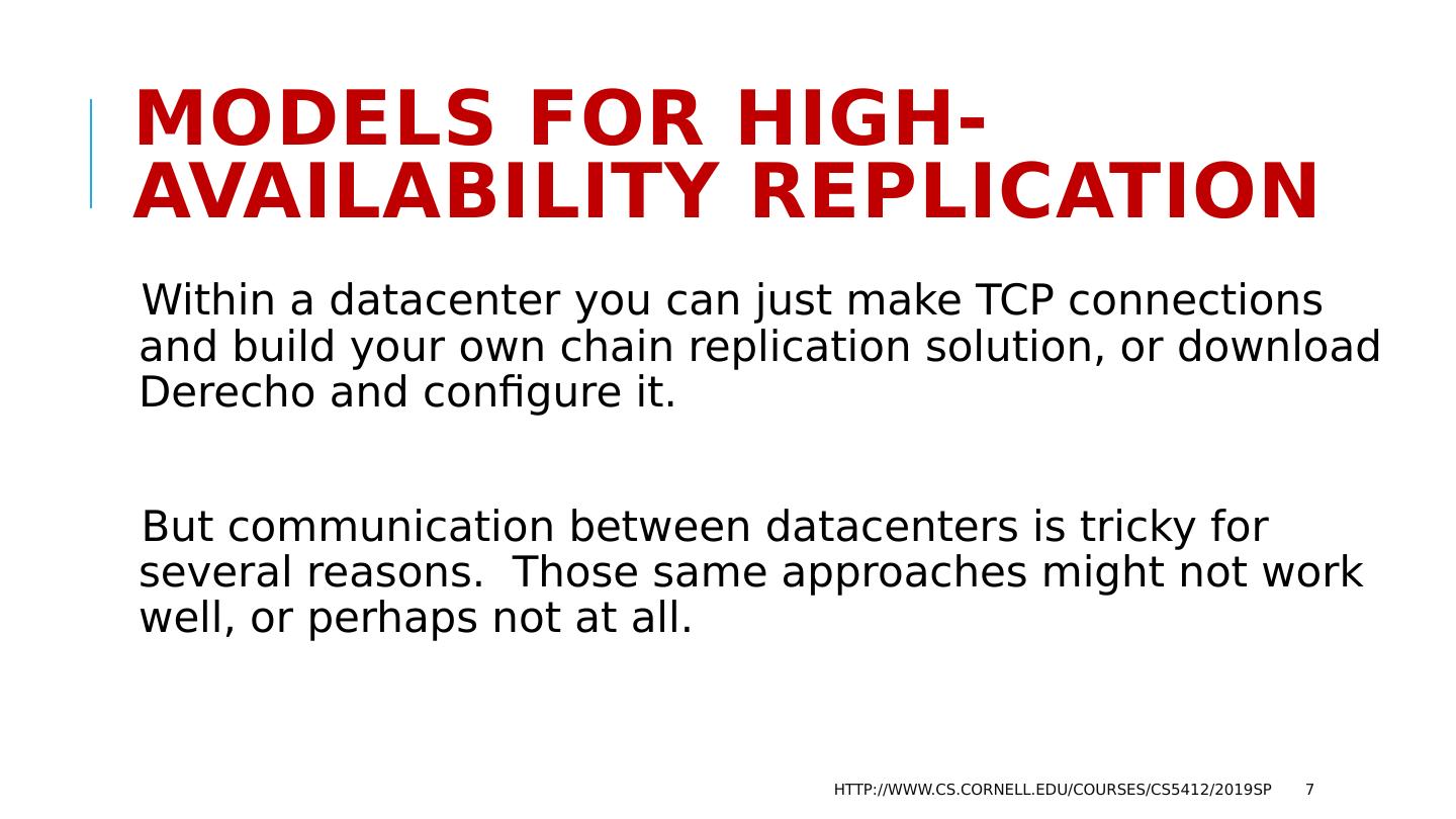 7 .Models for high-availability Replication Within a datacenter you can just make TCP connections and build your own chain replication solution, or download Derecho and configure it. But communication between datacenters is tricky for several reasons. Those same approaches might not work well, or perhaps not at all. http://www.cs.cornell.edu/courses/cs5412/2019sp 7