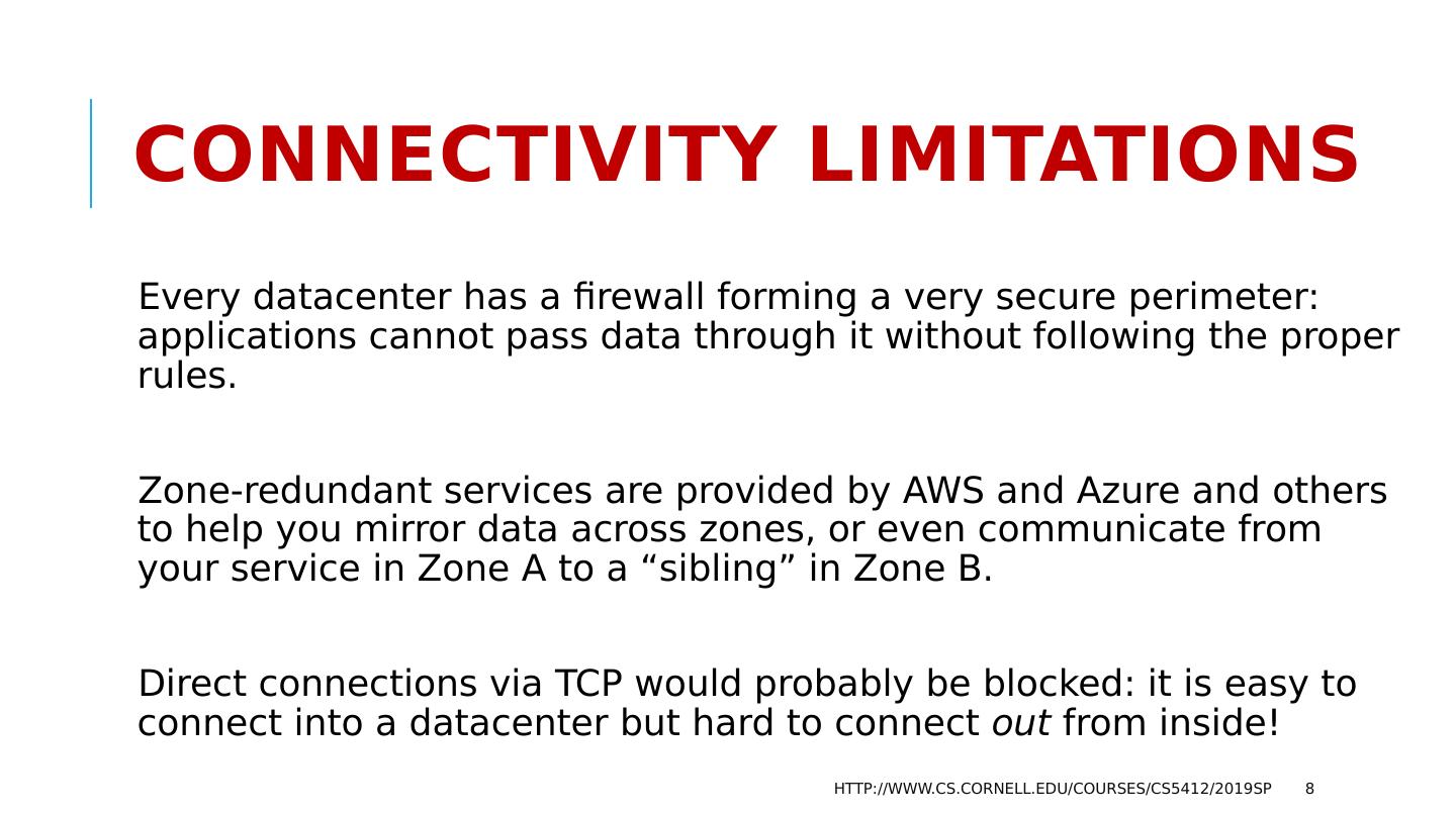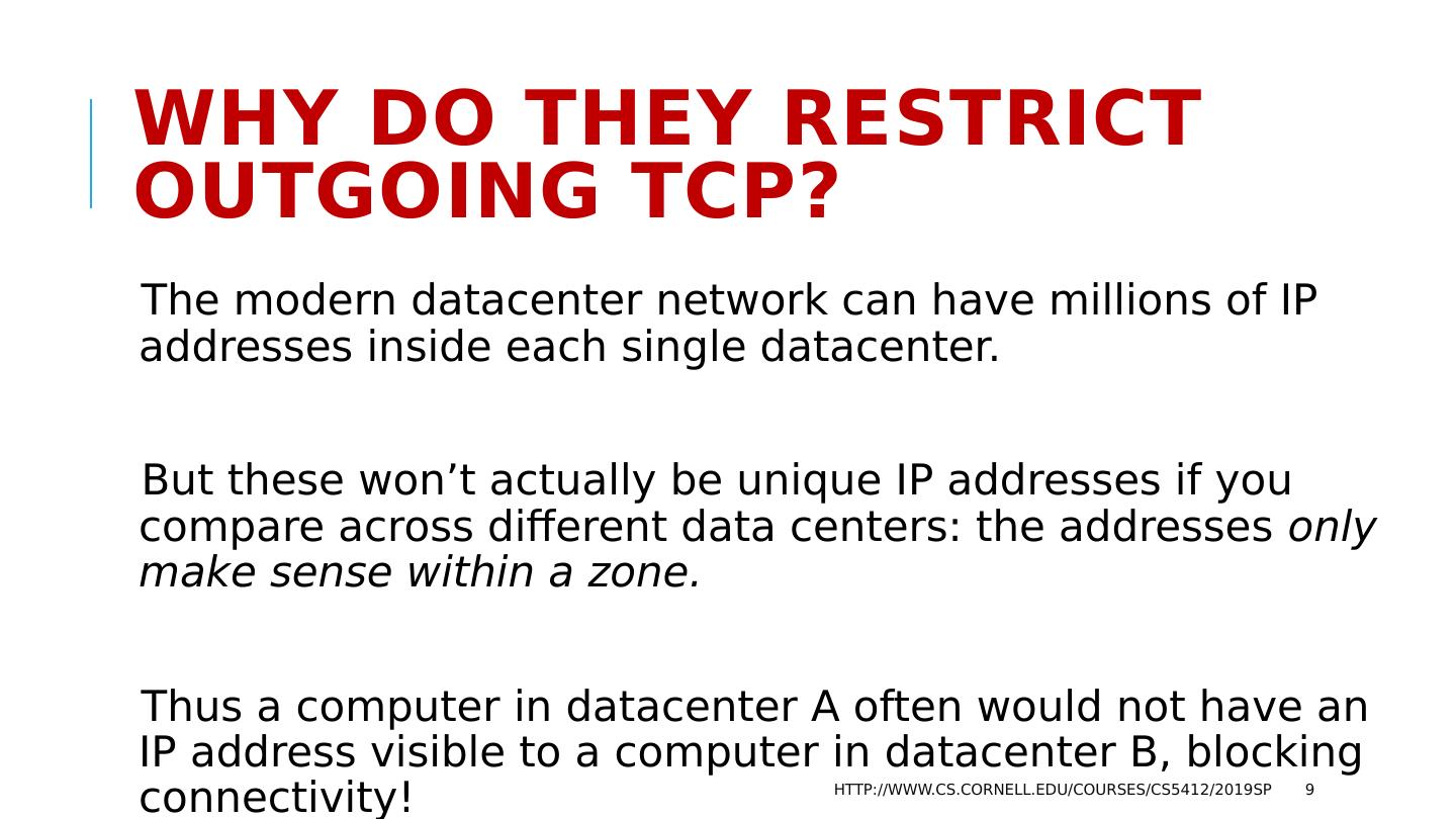 9 .Why do they restrict outgoing TCP? The modern datacenter network can have millions of IP addresses inside each single datacenter. But these won’t actually be unique IP addresses if you compare across different data centers: the addresses only make sense within a zone. Thus a computer in datacenter A often would not have an IP address visible to a computer in datacenter B, blocking connectivity! http://www.cs.cornell.edu/courses/cs5412/2019sp 9