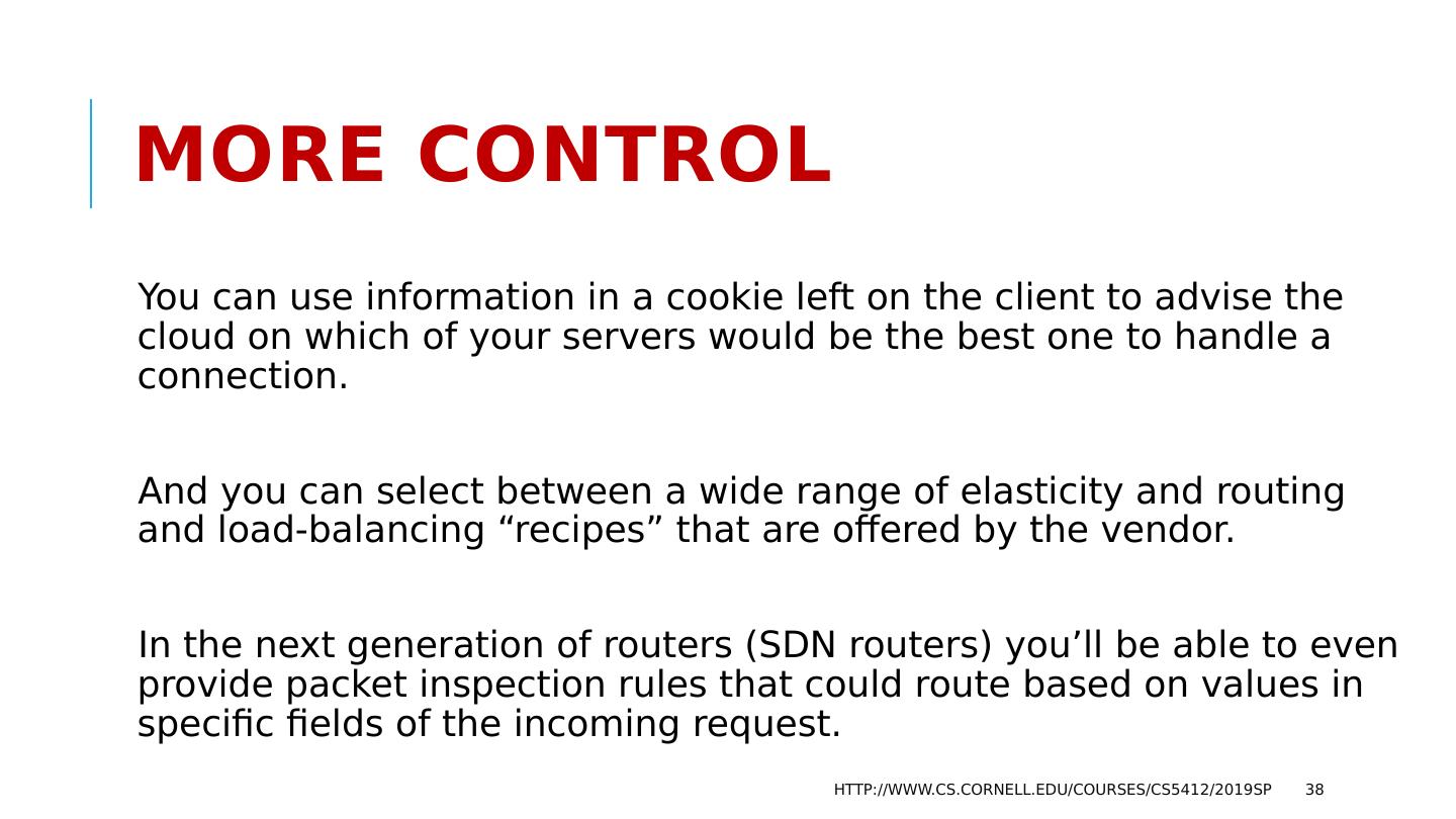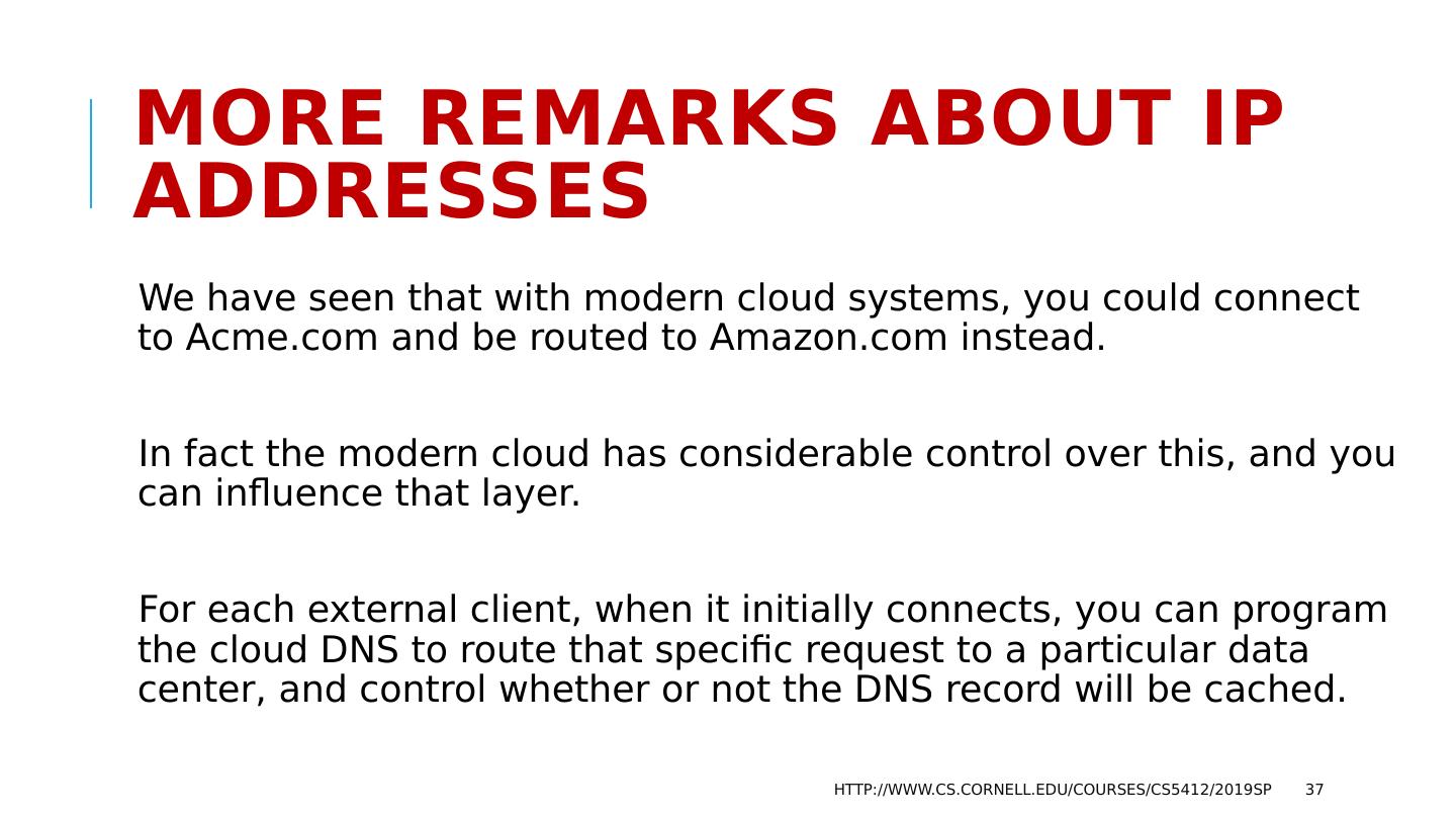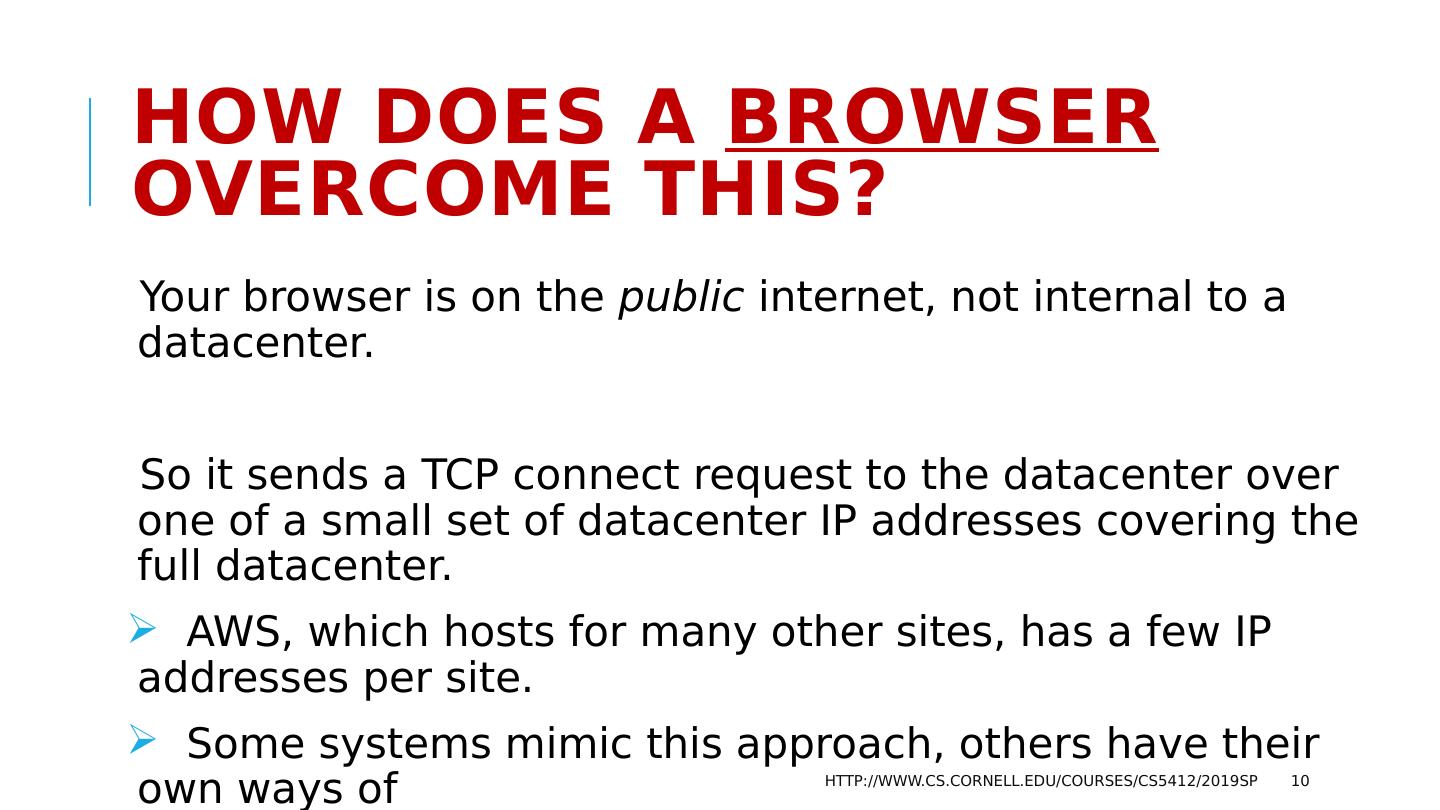 10 .How does a browser overcome this? Your browser is on the public internet, not internal to a datacenter. So it sends a TCP connect request to the datacenter over one of a small set of datacenter IP addresses covering the full datacenter. AWS, which hosts for many other sites, has a few IP addresses per site. Some systems mimic this approach, others have their own ways of ensuring that traffic to Acme.com gets to Acme’s servers, even if hosted on their framework. http://www.cs.cornell.edu/courses/cs5412/2019sp 10