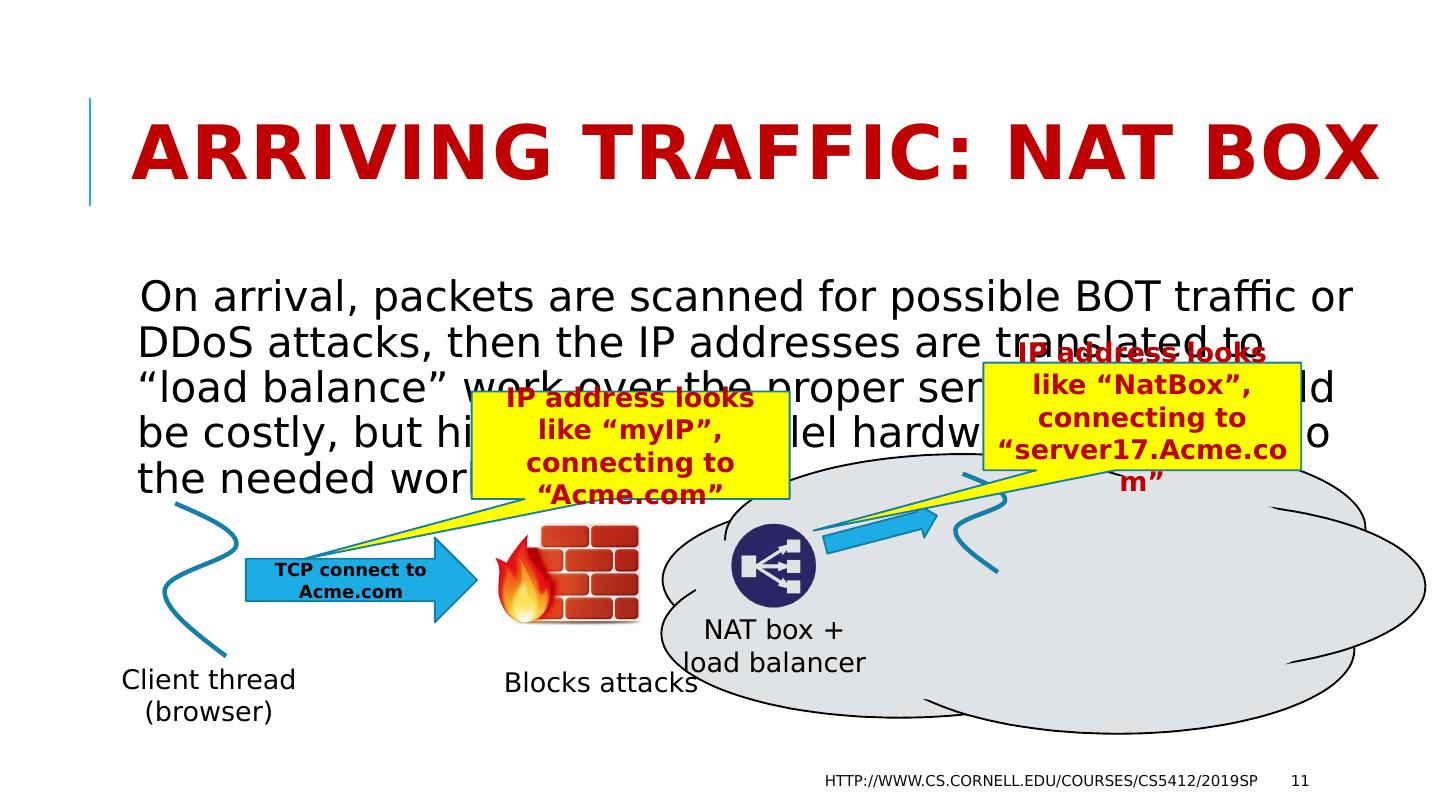 11 .Arriving traffic: NAT Box On arrival, packets are scanned for possible BOT traffic or DDoS attacks, then the IP addresses are translated to “load balance” work over the proper servers. This would be costly, but high-speed parallel hardware is used to do the needed work at line rates. http://www.cs.cornell.edu/courses/cs5412/2019sp 11 TCP connect to Acme.com Blocks attacks NAT box + load balancer Client thread (browser) IP address looks like “ myIP ”, connecting to “Acme.com” IP address looks like “ NatBox ”, connecting to “server17.Acme.com”