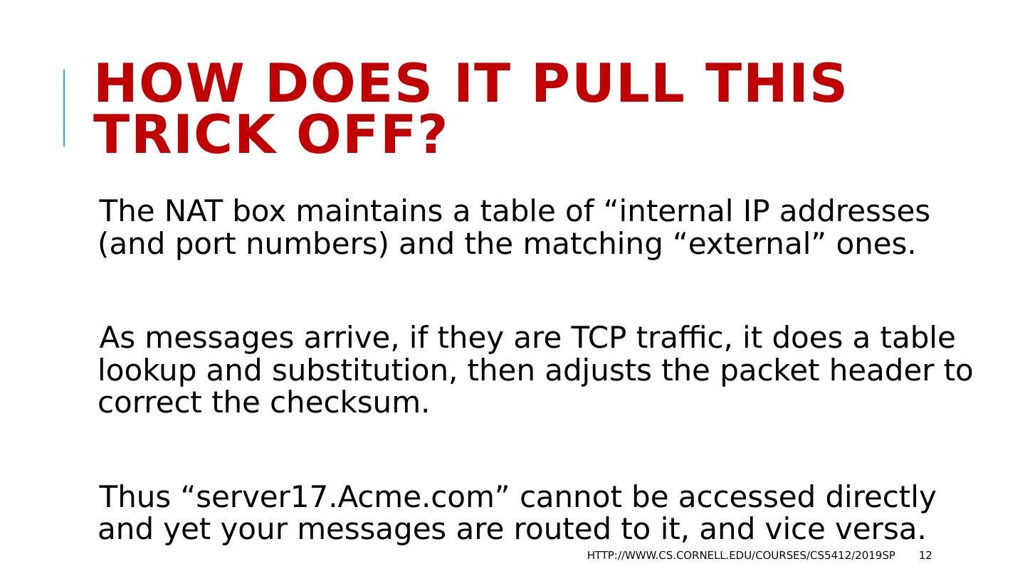 12 .How does it pull this trick off? The NAT box maintains a table of “internal IP addresses (and port numbers) and the matching “external” ones. As messages arrive, if they are TCP traffic, it does a table lookup and substitution, then adjusts the packet header to correct the checksum. Thus “server17.Acme.com” cannot be accessed directly and yet your messages are routed to it, and vice versa. http://www.cs.cornell.edu/courses/cs5412/2019sp 12