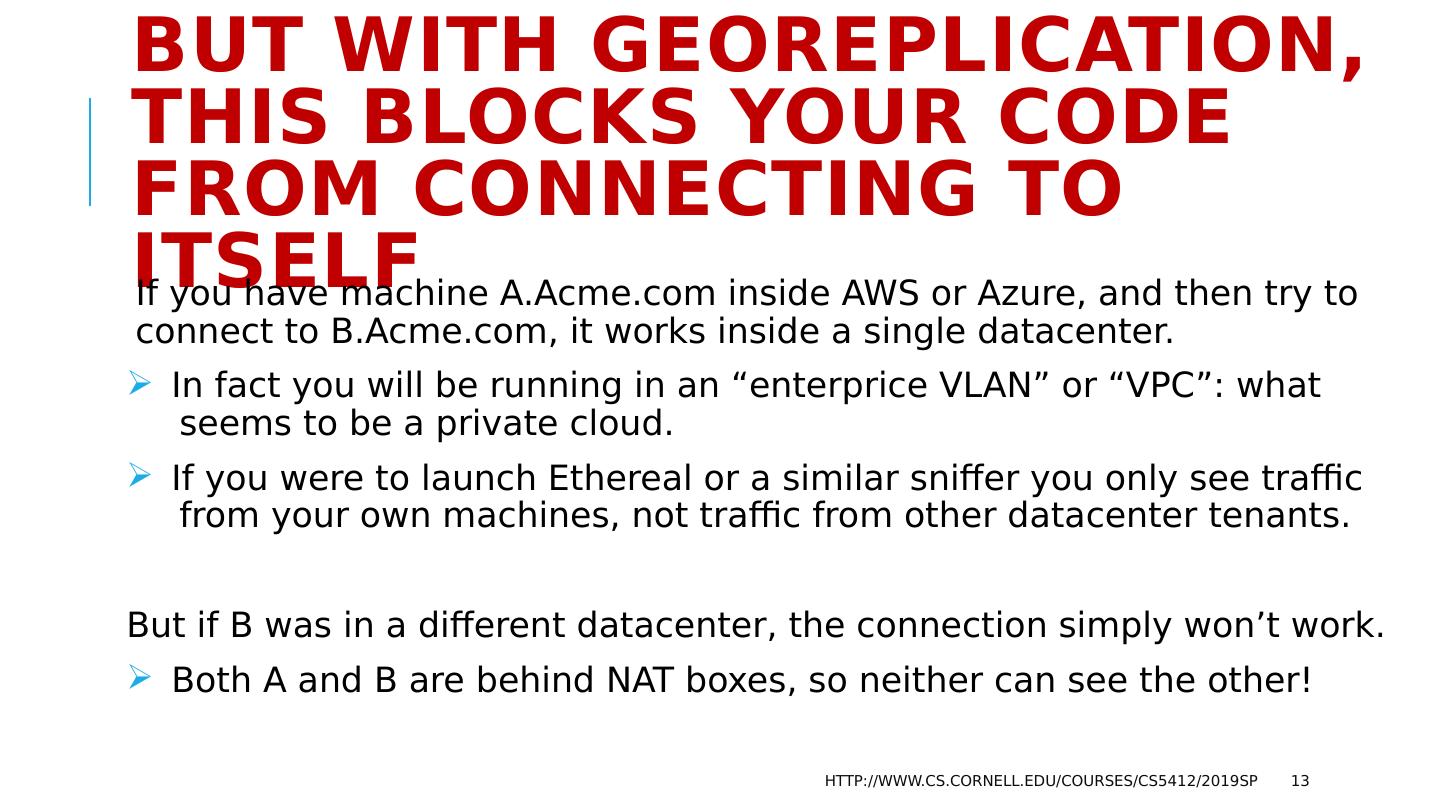 13 .But with GeoReplication , this blocks your code from connecting to itself If you have machine A.Acme.com inside AWS or Azure, and then try to connect to B.Acme.com, it works inside a single datacenter. In fact you will be running in an “ enterprice VLAN” or “VPC”: what seems to be a private cloud. If you were to launch Ethereal or a similar sniffer you only see traffic from your own machines, not traffic from other datacenter tenants. But if B was in a different datacenter, the connection simply won’t work. Both A and B are behind NAT boxes, so neither can see the other! http://www.cs.cornell.edu/courses/cs5412/2019sp 13