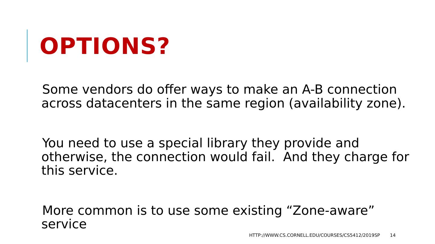 14 .OptioNs ? Some vendors do offer ways to make an A-B connection across datacenters in the same region (availability zone). You need to use a special library they provide and otherwise, the connection would fail. And they charge for this service. More common is to use some existing “Zone-aware” service http://www.cs.cornell.edu/courses/cs5412/2019sp 14