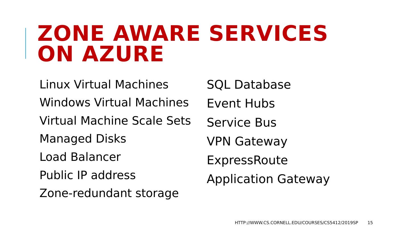 15 .Zone Aware Services on Azure Linux Virtual Machines Windows Virtual Machines Virtual Machine Scale Sets Managed Disks Load Balancer Public IP address Zone-redundant storage SQL Database Event Hubs Service Bus VPN Gateway ExpressRoute Application Gateway http://www.cs.cornell.edu/courses/cs5412/2019sp 15